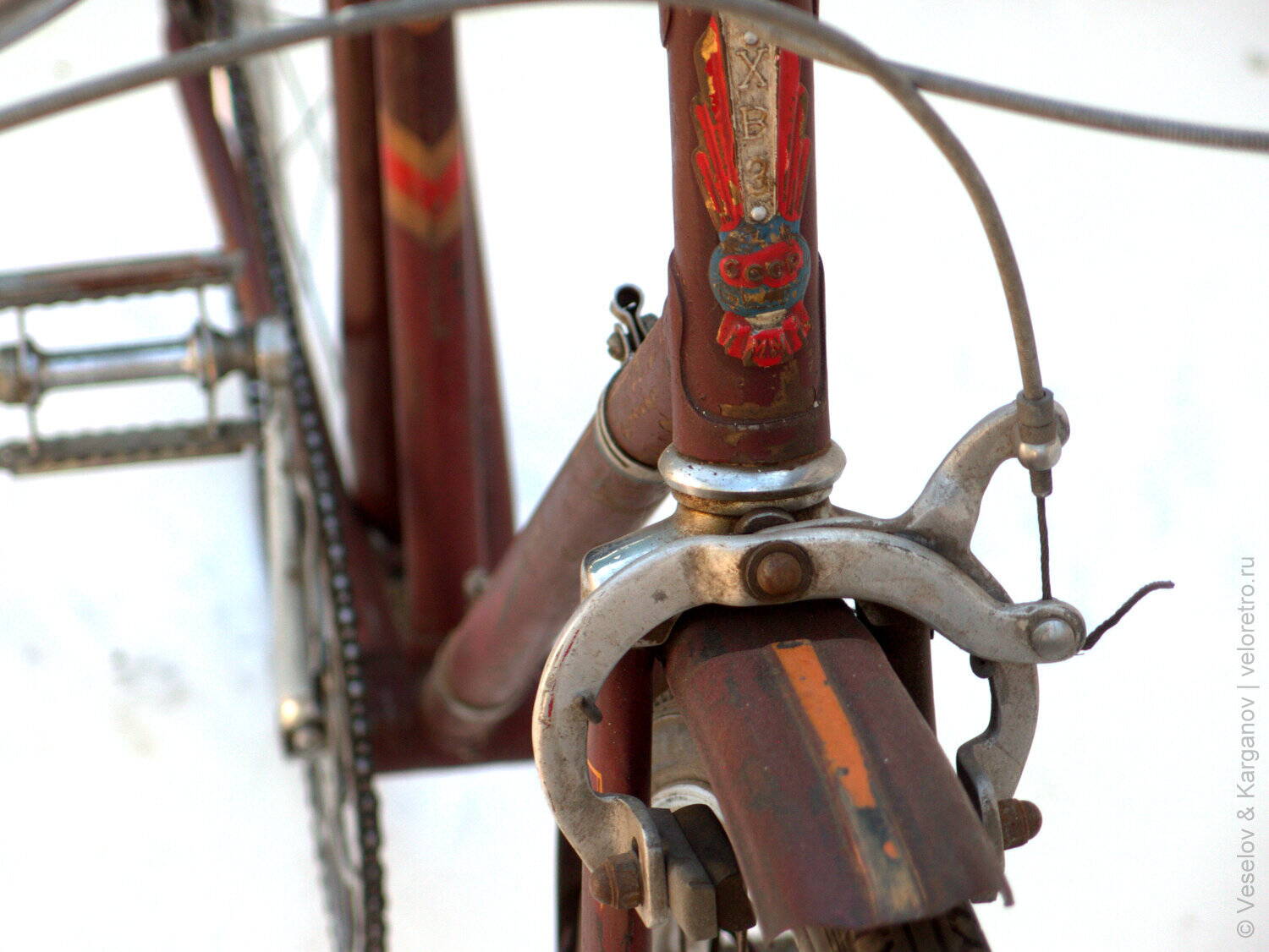 Поэтому примерно с 1960-х гг. распространились клещи с центральной тягой. Непонятно, почему, кстати. Привод их имеет много сочленений, он излишне упругий (за счёт «лишнего» поперечного тросика и «клювов» - упоров боудена на рулевой колонке и подседельном болте). Вроде от осей рычагов до колодок плечо рычага маленькое, но сами эти оси при работе тормоза упруго расходятся… Вобщем, неясно, за какие заслуги этот тип тормоза доминировал на гоночных велосипедах лет 20. За немного более надёжную регулировку?