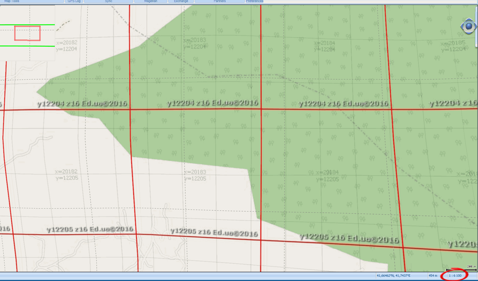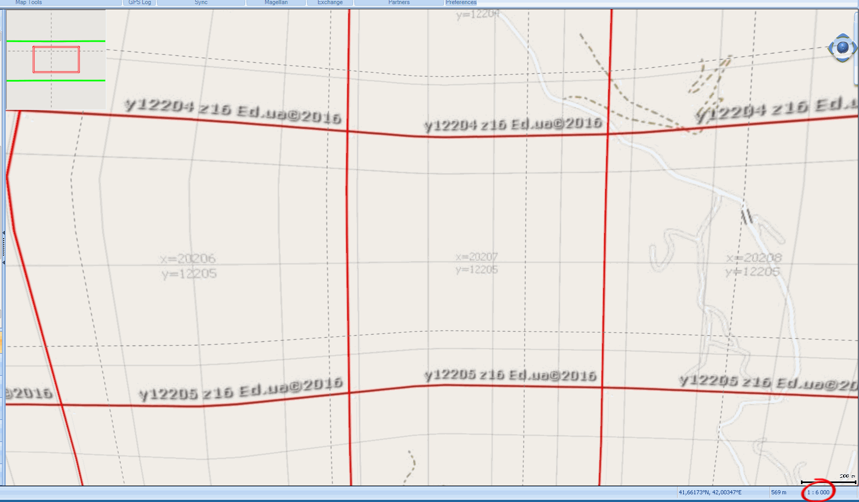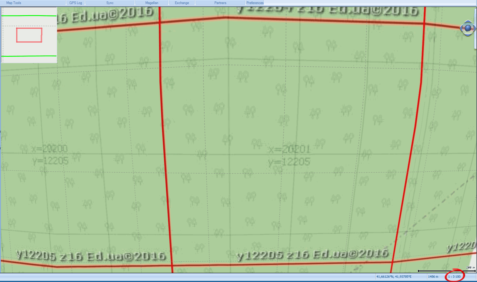 2) по полученным данным вычисляю градусы/пиксель для дальнейшего ресамплинга в GM: 1700м - это 5 отрезков по 240м, что должно соответствовать 5 * 68пикселей на экране навигатора. Получаю 7.2711764e-5 град/пиксель.