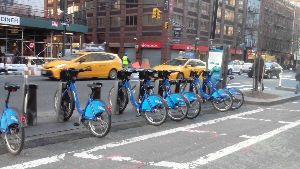 Во время путешествия домой была длинная пересадка в аэропорту Нью-Йорка. Получилось выбраться в Манхэттен и погулять по 8-й авеню в течени часа. На улице было не очень приятно. Около нуля и довольно ветренно. Тем не менее, очень много велосипедов и велосипедистов на улице. Некоторые велосипеды пристенуты цепями, которые по весу сравнимы с весом велосипеда :smile: . Причем стараются пристегивать не только раму, но и оба колеса. Иногда исппользуется по два тросика или цепи.