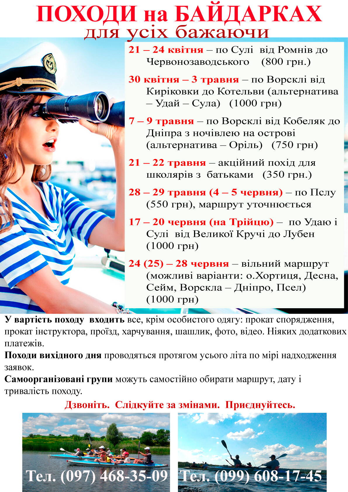 Обратите внимание! Информация может меняться. Подробный график походов и цены Вы можете узнать в группе ВК «На байдарках по Суле в апреле - готовимся.» - https://vk.com/event112578983 и на странице ВК https://vk.com/id161676642 а так же по телефонах: (097)468-35-09, (099)608-17-45