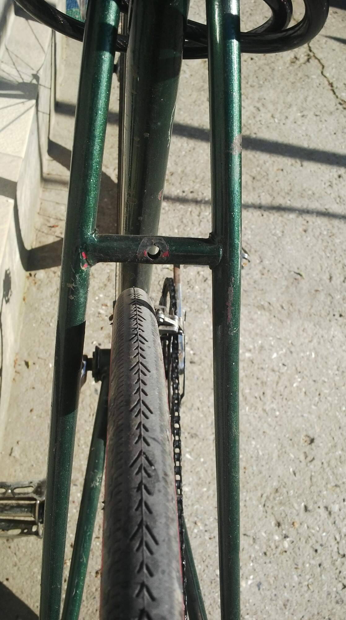 Теперь нужно переспицевать заднее колесо с правильным зонтом. Я так понимаю,обод должен находиться относительно середине между регулировочными гайками втулки,но не фланцев???Ниже фото с расположением колеса относительно задних перьев рамы.