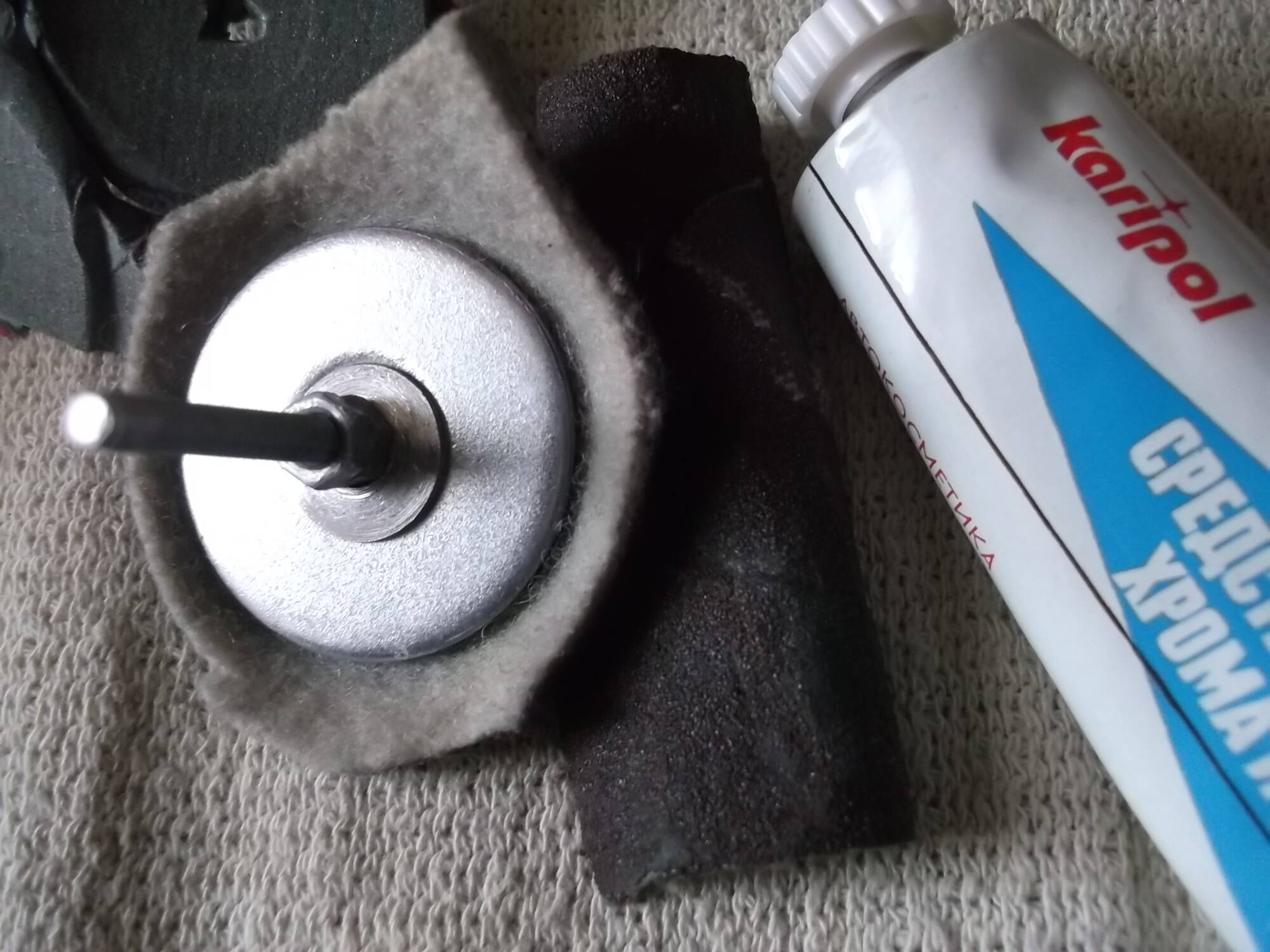 Дрель, большие шайбы(30 и 37мм) для фиксации шлиф. бумаги и фетра, шлифовка 125/1000 и полировка фетр, керосин, паста karipol.
