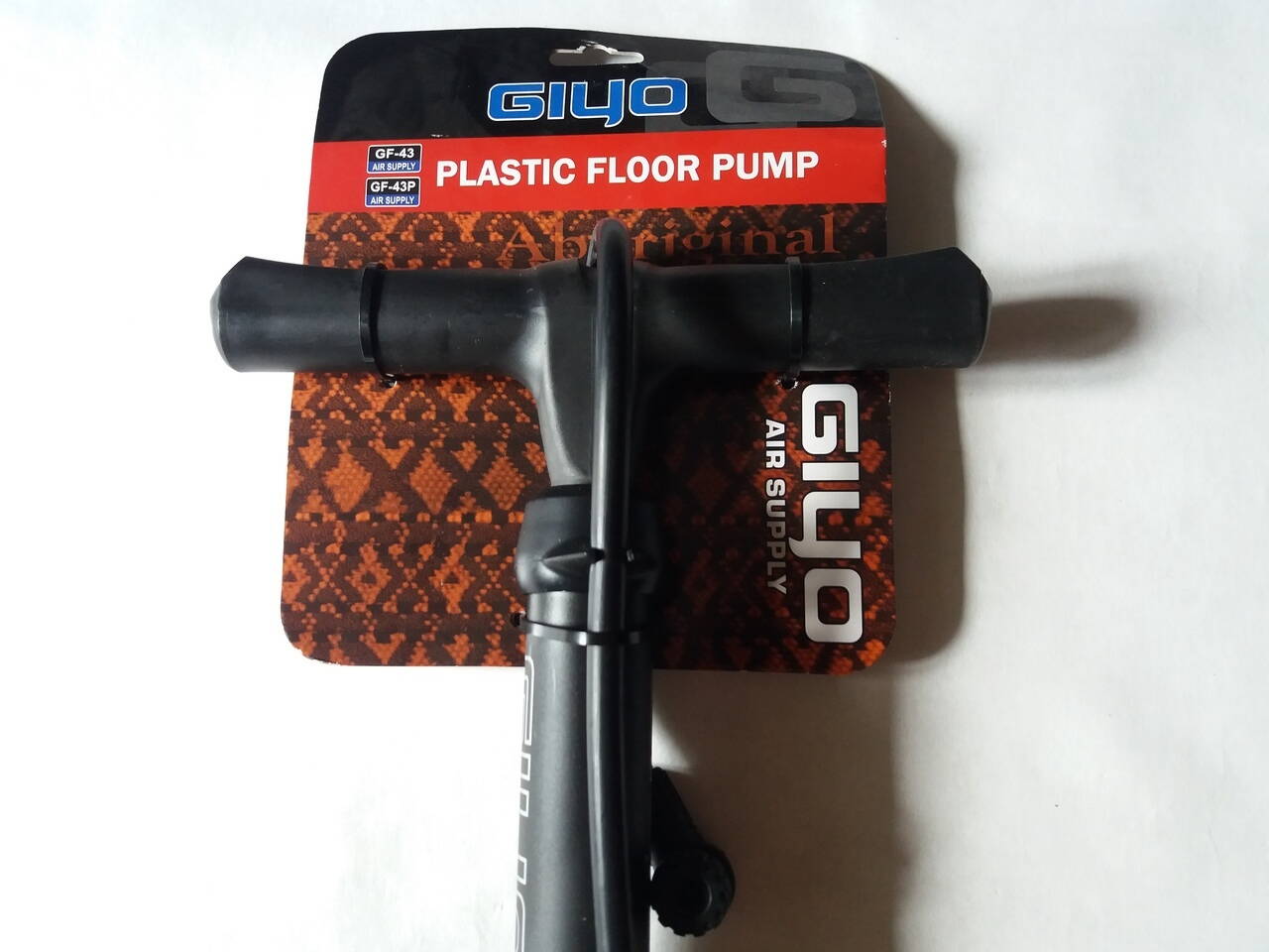 Напольный насос для велосипеда Giyo GF-43P, чтобы качать камеры с типом нипеллей Presta, Schrader, Dunlop. Пластиковый, с гибким шлангом и пластиковой подножкой. Максимальное давление 120 psi/8.3 bar. На манометре две шкалы psi, bar.