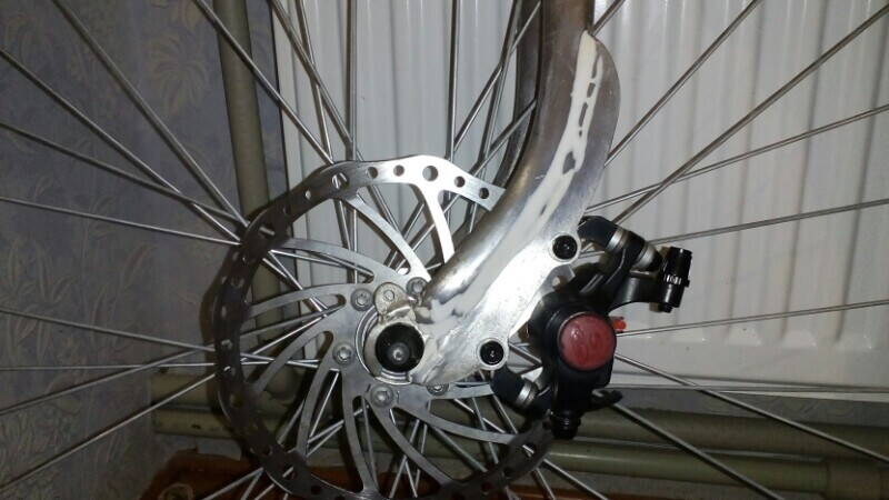 Вот прикрепил фото. Вопрос следуещего характера, не слишком длинное крепление приварил к вилке вверх, сделал что бы вилку не сломало, откатал немного все норм. Не знаю просто в какую сторону сила диска направлена при торможении при езде? Так конечно надежнее, но есть ли смысл немного обрезать до середины изгиба перьев вилки что бы вилка как то хоть не много гасила вибрации, не сломается ли она потом? И сверху приварил ушко которое будет через пластину держать ось втулки да бы колесо не выскочело из дропаутов, по тому как эксцентрик у меня, я доверия к нему чет нету. Кто что подскажет.
