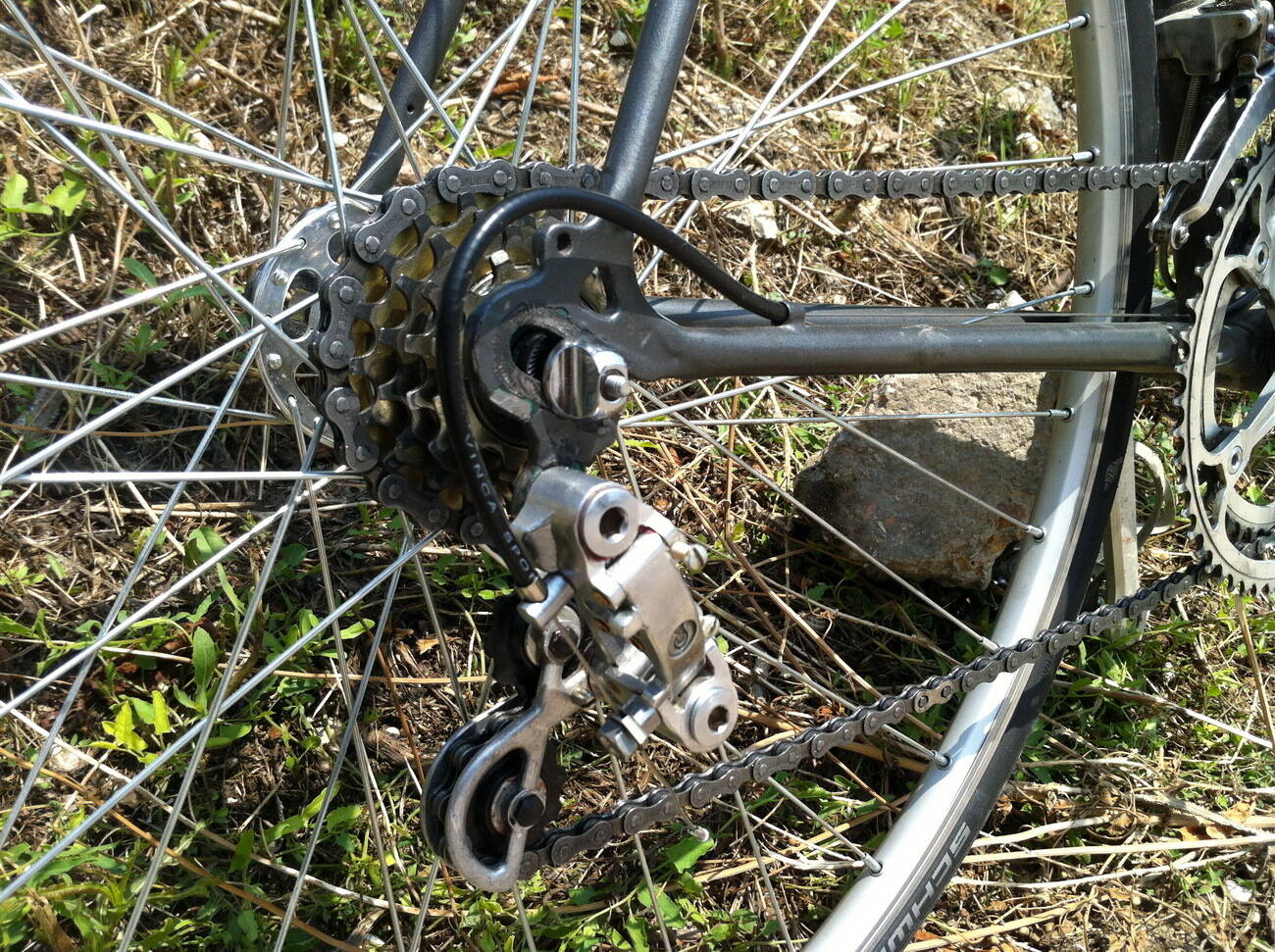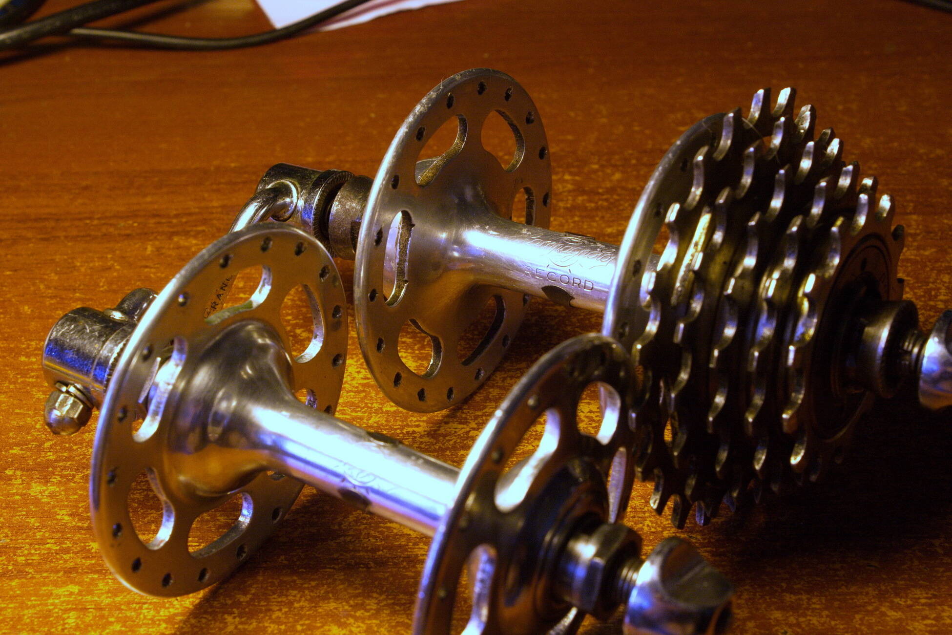 Все доброго вечера. Собрал колеса на новых втулках , итоговый вариант вот такой: втулки Campagnolo Record, пятерик Shimano Dura-Ace , обода и эксцентрики MAVIC, шины Schwalbe Lugano 700*23, задний переключатель ПВЗ . Спасибо за внимание !