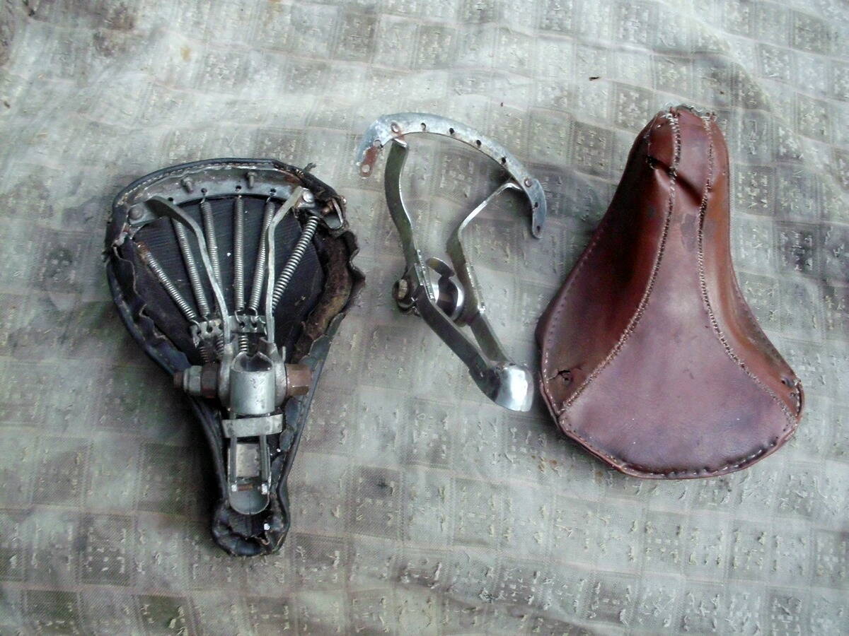 Седло. Могу допустить, что на этом веле катал спортсмен, возможно любитель для себя. И не очень удобное мягкое седло он мог заменить на спортивное жёсткое. Если что, у меня уже есть кой-какой мотлох, да он и попадается - коричневое и его каркас под реставрацию, черное - донор.