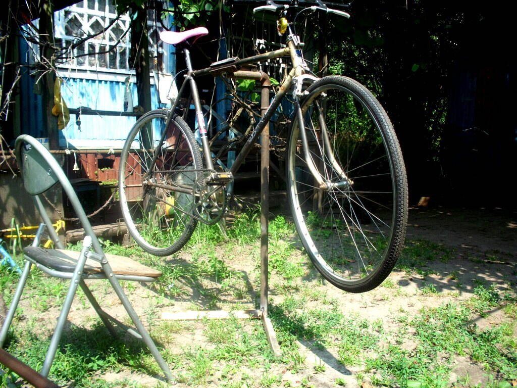 Велосипед закреплён за горизонтальную трубу рамы.