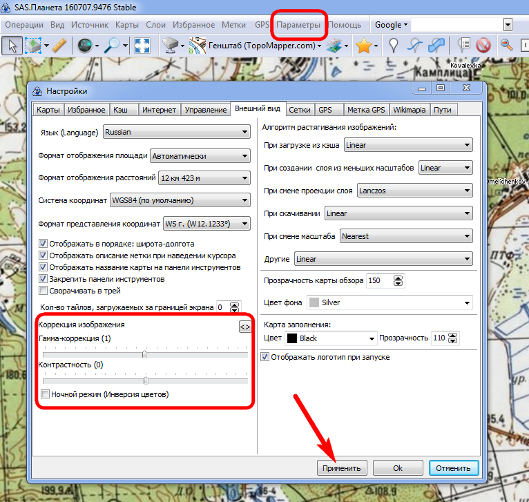 Изменить контраст изображения можно прямо в SAS Планете: Настройки - Внешний вид.