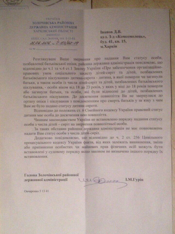 Друзья, наша длительная борьба за восстановление документов Дани ( Данил Иванов) и присвоения ему статуса сироты закончилась вот таким ответом от Золочевской районной администрации. Он не обратился к ним до достижения совершеннолетия, и поэтому присвоить статус они не могут. Наше огромное пояснительное письмо о том, что мама умерла за неделю до совершеннолетия, о том, что было утеряно огромное количество документов, на восстановление которых понадобилось время, было полностью проигнорировано.