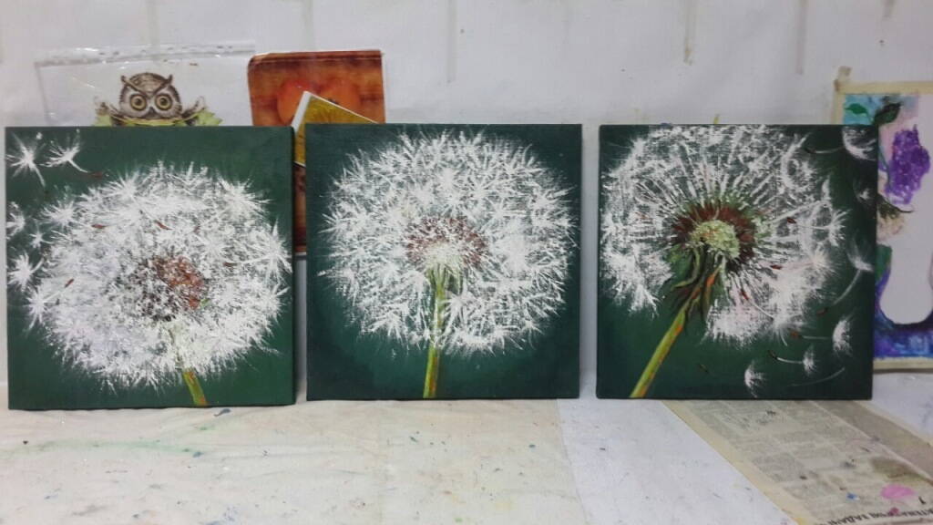Вот последние несколько работ жены. Подсолнухи- перерисованный Ван Гог, какая то танцовщица Фламенко. И авторская ,мой заказ- композиция из одуванчиков на кухню. Думаю до рамы "Счастливчика" она уже доросла? :oops: