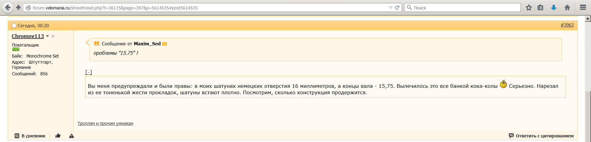 На выходных был на велорядах, щупал валы под клин: проблема под названием "15.75" стоит в полный рост. ...