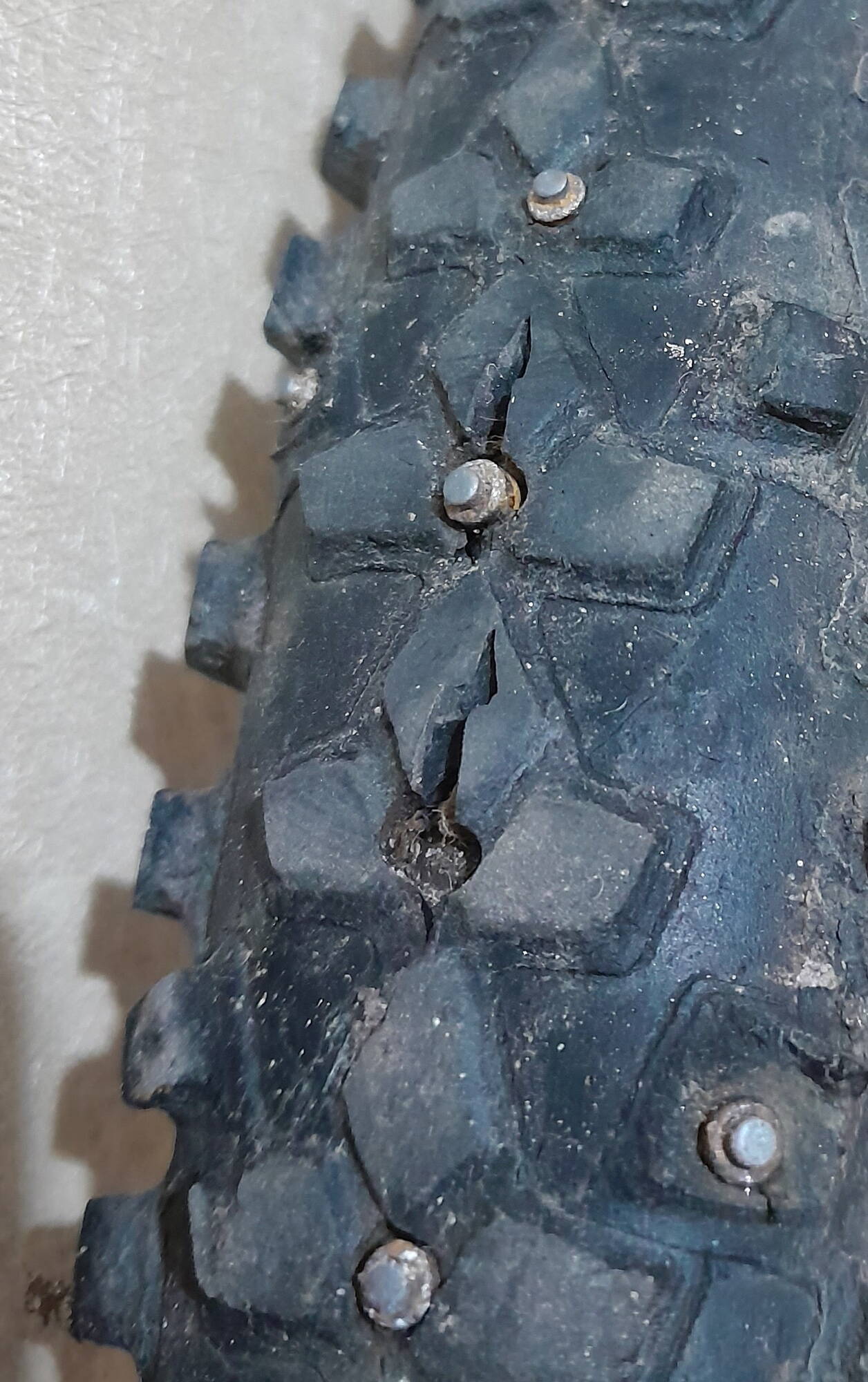 Решил забросить инфы и струсить пыль с древней статьи и темы. Увы, ничто не вечно под луной. Только пришли морозы и поставил самопальную шипованную покрышку пусть и с заводскими шипами.. пара поездок и покрышка пошла грыжами. Вот так загнулся вариант с шипами вставленными в сквозные отверстия по центральной оси и в срезанные по высоте пины по бокам, на следующем этапе экспериментов. Всё-таки сквозные отверстия нагруженные ёрзающими шипами привели к разрывом тела покрышки. Но... покрышка свое отработала, откатав не одну зиму, пусть обычно 200-400км в сезон. Часть шипов может использую в следующей версии. Так что... ничто не вечно. Ну, остается еще один СмартСэм, где центральный ряд сквозные отверстия, а вот в боковых пинах бил полости фрезой. Вот уже не помню, какая покрышка сколько отбегала.