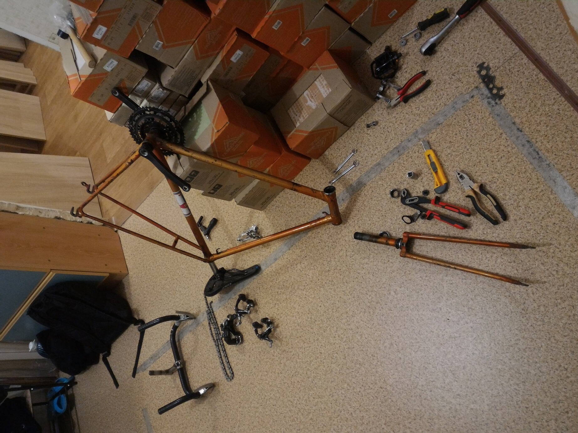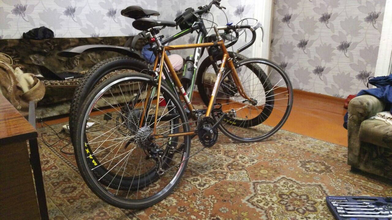 Это мы готовили отверстия для крепления бутылки, потом впаяли бонки. А после зачищали раму полностью. У нас есть образцы деколей, закажем новые наклейки. Возможно фото повторяется, коллега тоже тут трется. Шимановские 105 передние звезды с шатунами купили у одного из администраторов этого сайта.