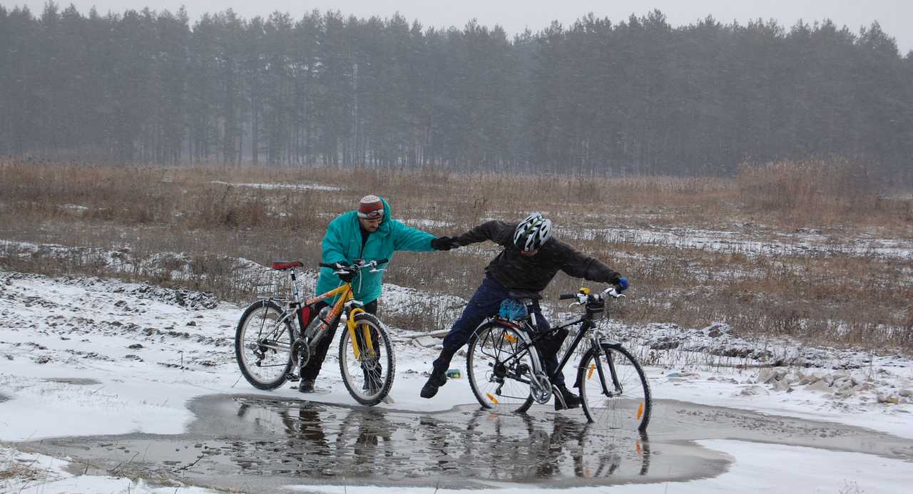 Все началось с того, что я с "бородой" отправились в Харьков на элке с отправлением 6.10 с Чугуева. У нас было в запасе много времени, поэтому решили остановится в хлебном киоске попить чаю. Я сижу весь морально подавленный, оттого, что будет более 20 человек и полузнакомый маршрут. Но Андрей "Борода" меня морально поддержал, добавил мне уверенности. Через некоторое время мы доезжаем до "Метро" и снова вижу почти все знакомые лица, мне становится очень приятно видеть тех людей. которые не побоялись такой снежной погоды и решились проехать этот непростой маршрут. Несмотря на то, что был рваный темп или отставание участников, мы никого не бросили. Были моменты, что некоторые догоняли основную группу по следам. Главное, что никто не заблудился из 22 человек. Очень приятно, когда мы помогаем друг другу в починке велосипеда и в другом. Был такой момент, когда уже остановились разжигать костер. Я все думал где же подевались несколько отставших участников. Потом вижу, как "Швинопас" подъезжает ко мне и говорит, что двое сильно устали, и в двух минутах езды от нас сидят перекусывают. В итоге я с Сергеем "Швинопасом" поехали к ним и сказали, что мы все находимся от вас недалеко, но уже возле костра. Они охотно собрались и присоединились к нам.