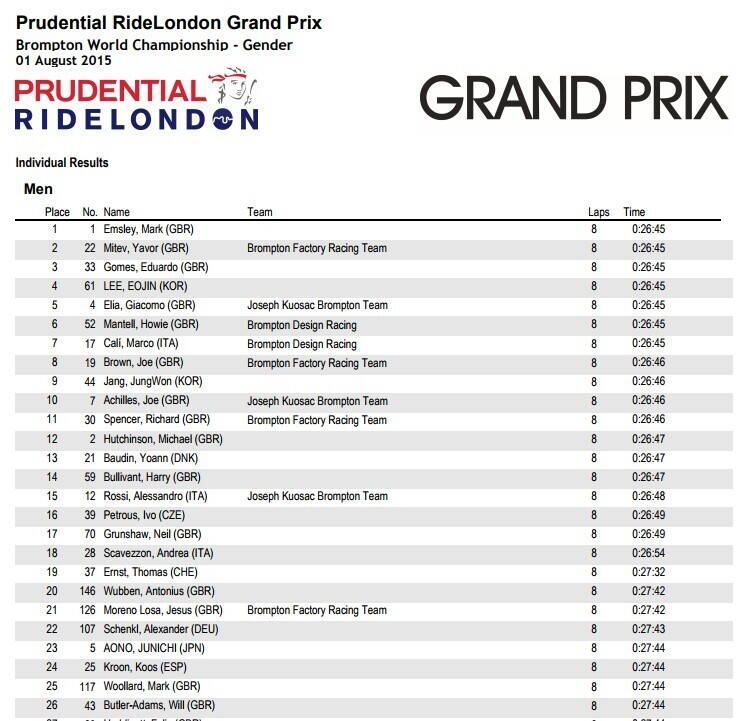 Заезд начинается с забега, складывания вела и только потом уже велогонка. А вот официальные результаты 2015 года. Даже если не брать время победителей, для примера 50-й участник финишировал со временем 28:52. Средняя скорость его почти 36км/ч.