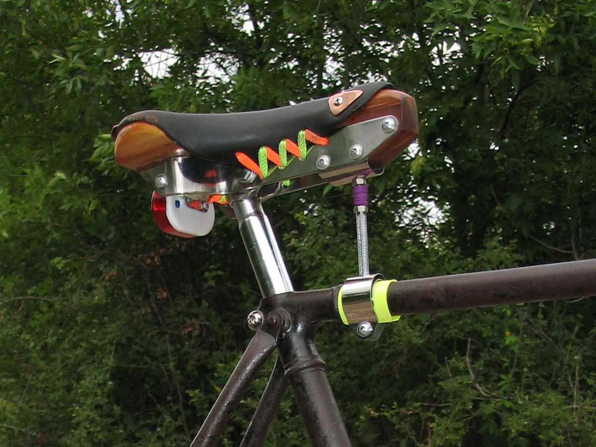 Верхняя часть винта входит в деревянный нос седла, там достаточно широкое и глубокое отверстие чтоб можно было поднять-опустить седло на пару сантиметров. И фиксируется это двумя гайками, под пластиной из нержавейки и над ней, внутри между деревяшкой и пластиной. Таким образом седло не может сдвинуться ни вверх ни вниз. Держит крепко, однажды я выехал вообще с незатянутым болтом замка седла, и обнаружил это только потому что оно подозрительно постукивало и немного люфтило.