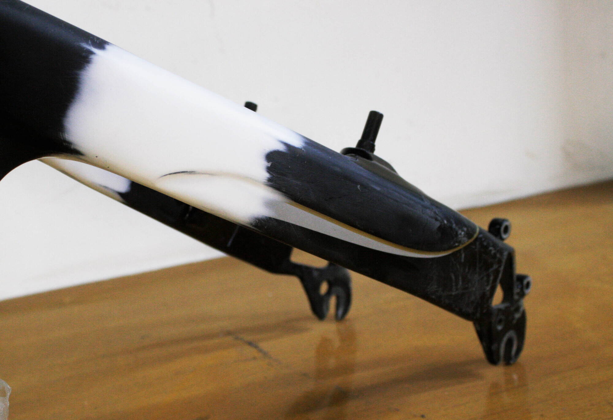 Відновлення лакофарбового покриття на пошкодженій ділянці складного карбонового велосипеда Nasa. Попередньо карбоном було відновлено пошкоджену діялку, вишліфовано і підшпакльовано карбоновою шпаклівкою, покито 2-ма шарами грунту, чорна базисна емаль з переходом у текстуру карбону, розроблений трафарет тексту відповідно до оригінального взірця, нанесення тексту та декоративних елементів та покриття лаком.