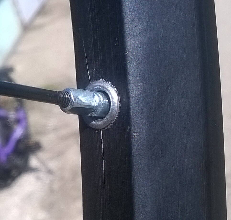 З.Ы. трещины на ободе могут возникать ещё от естественной усталости сплава, особенно это проявляется на легких и жестких ободах, где прочность достигается не толщиной стенки, а свойствами самого сплава. И то, что спицы одинаково натянуты не гарантирует, что они не были перетянуты - можно одинаково плохо перетянуть все спицы спицы на колесе. Правда, как правило вылетают от этого сами спицы, но при сочетании нескольких факторов могут и трещины на ободе пойти - вот нафоткал клиентского:
