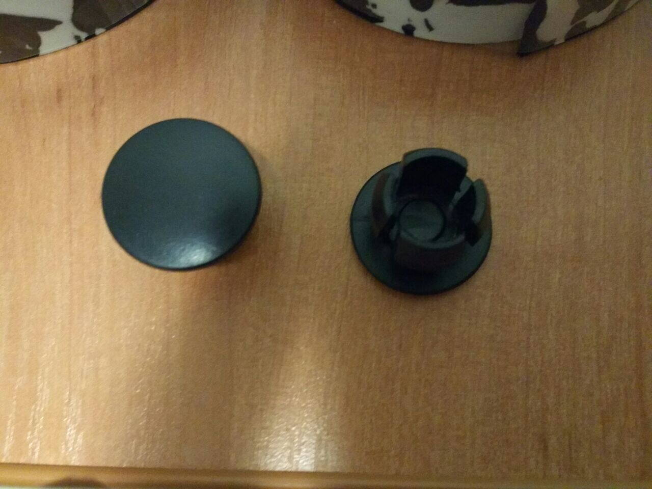 Заглушки из пластика типа "дешево но очень сердито". Они были слишком узкие и выпадали. Проблему решил наматыванием на основание десятка слоев изоленты по кругу. Помогло. Смотрятся, кстати, лучше чем закос под хром или другие блестяшки из пластика, который быстро затирается.