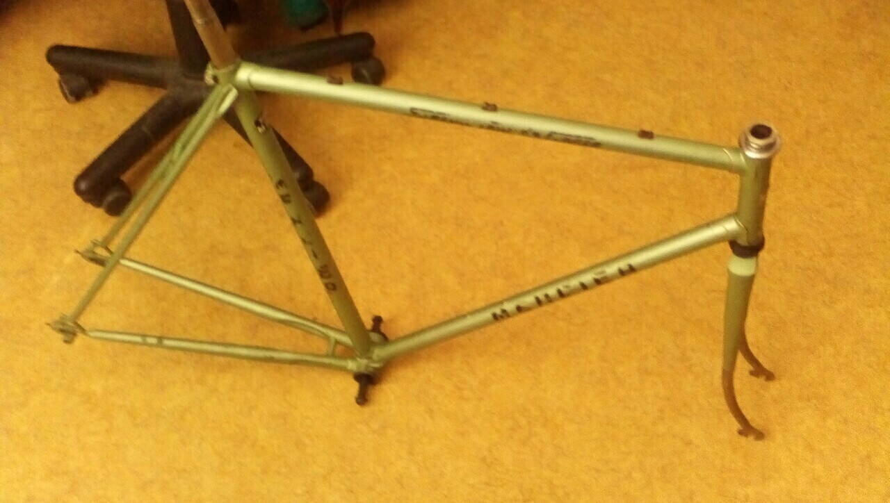 Собственно фрейм Mercier M28-26. Год определить не могу. По отверстиям для богажника&крыльев делаю заключение, что фрейм не шоссейный. Это к лучшему. Зазоры больше. Ведь я хочу собрать кроссовый вел.