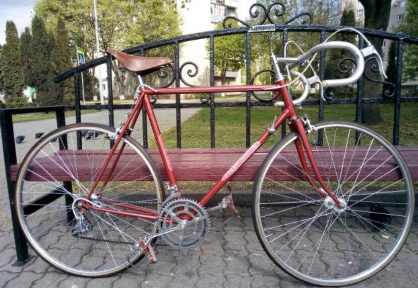 Рад всех приветствовать на форуме. Показываю свой экспонат. 80г №88. Он мне достался случайно, когда я еще не мог даже представить езду на спортивном велосипеде, больше 20 лет назад. Родной цвет был ядрено-оранжевый. Почти сразу же переспицевал его в обычные ободья, т.к. с трубками была беда - не купить. По юности я на нем ездил постоянно, по 1000 км в месяц. Со временем поменялось: одна звезда на тещетке треснула, стерлись передние звезды, ободья обновлялись, каретка кончилась - поставил картридж, лопнул один шатун по клину, кое где обновлялся набор шариков в подшипниках, родное сиденье растрескалось и хоть и раздобыл родную кожанную часть, пока катаюсь на недорогом но практичном седле. Было пару дтп, в результате чего правил весь фреймсет. Красил его раз 5. Сейчас я на нем не выезжаю постоянно, но несколько раз в год делаю путешествия в среднем по 100 км по пересеченке. Он в режиме циклокроса, позволяет набор звезд на трещетке 13-14-15-17-20, и шины.
