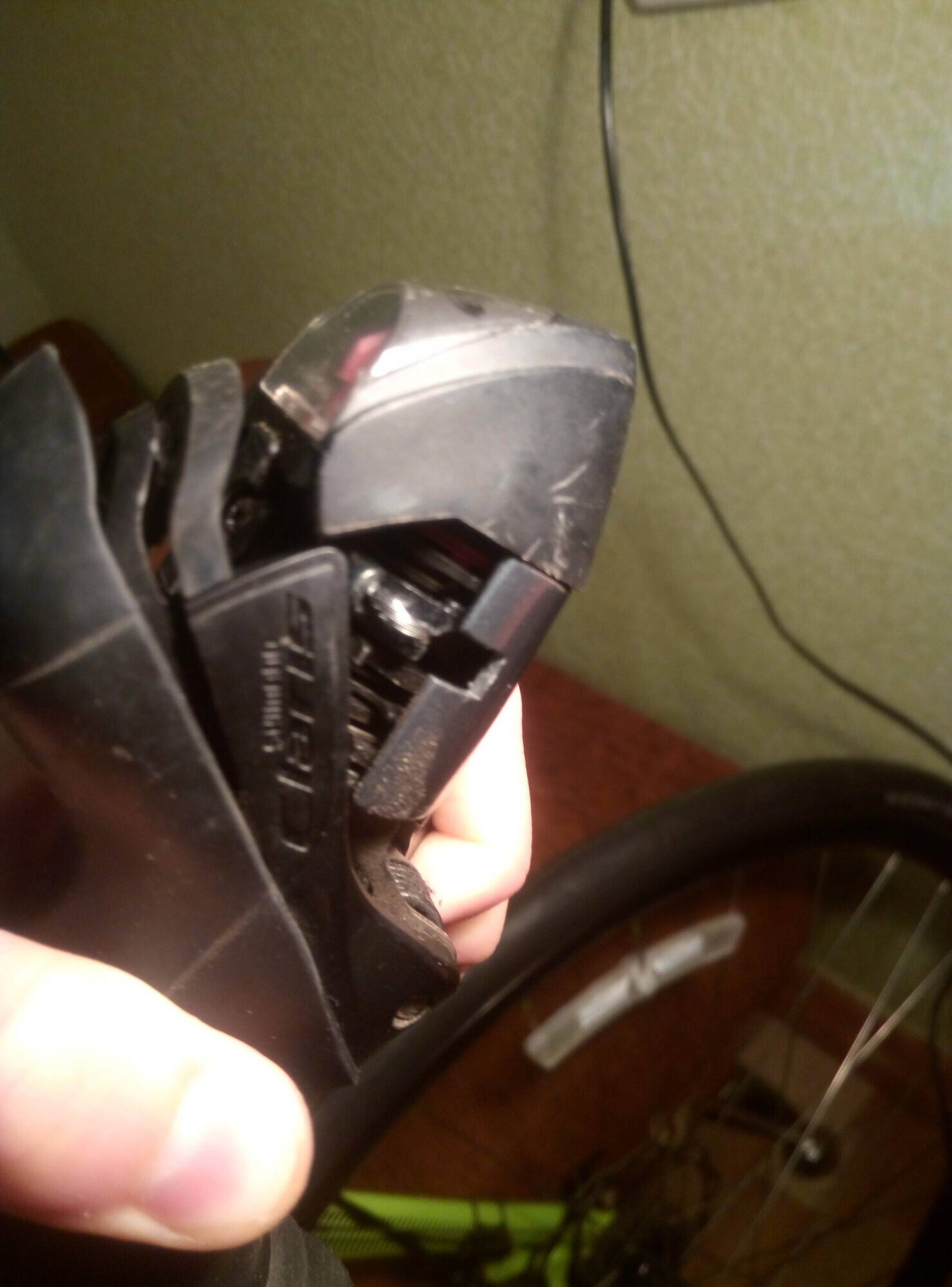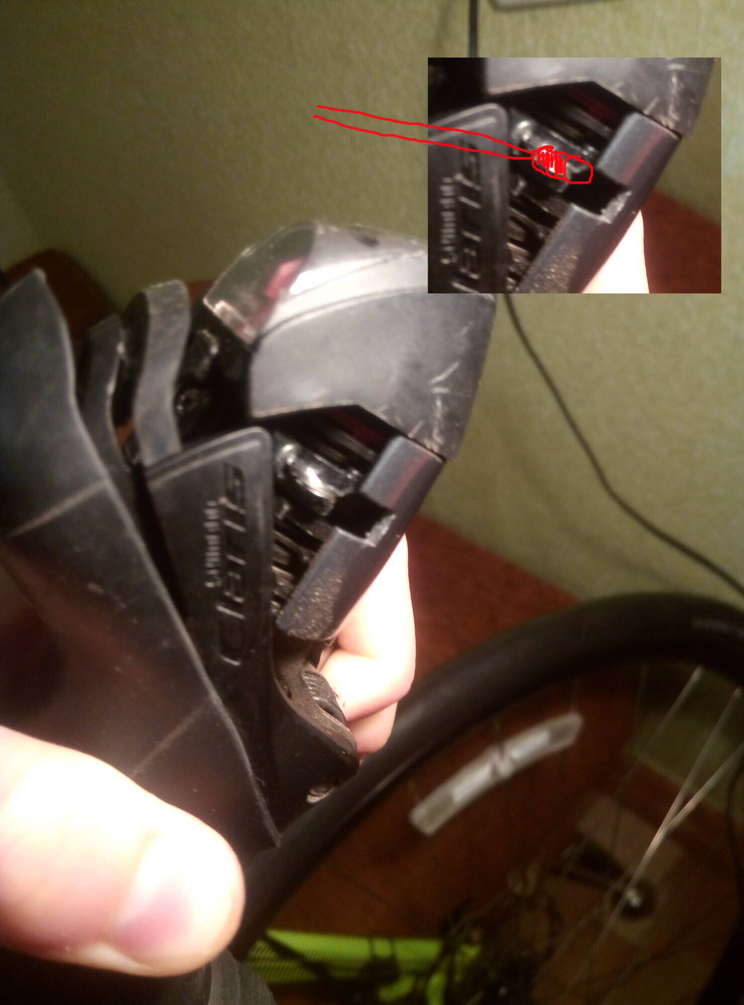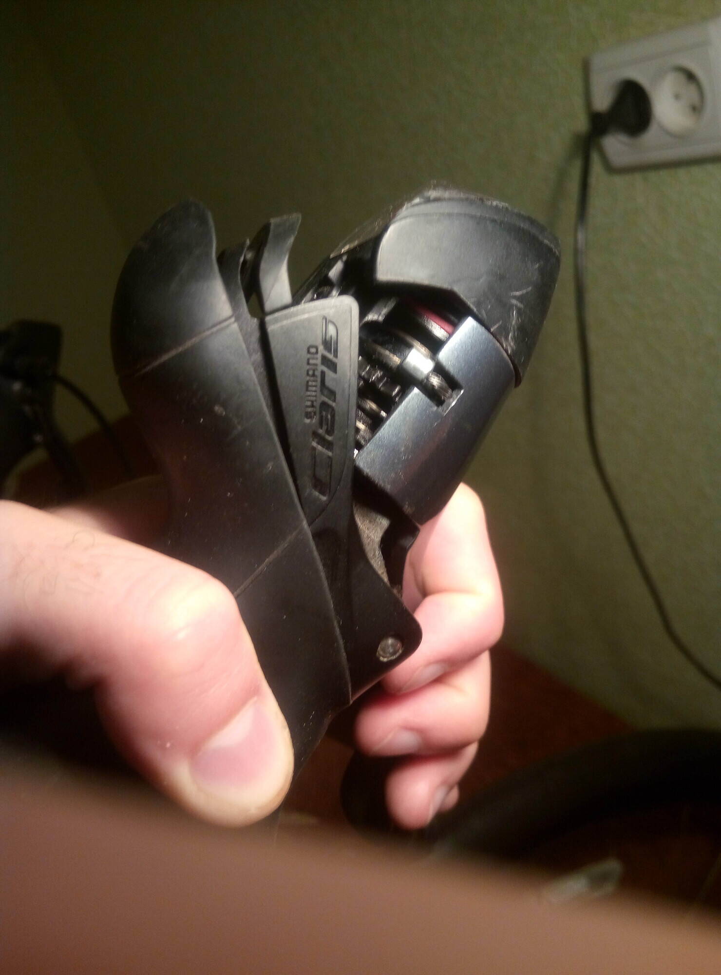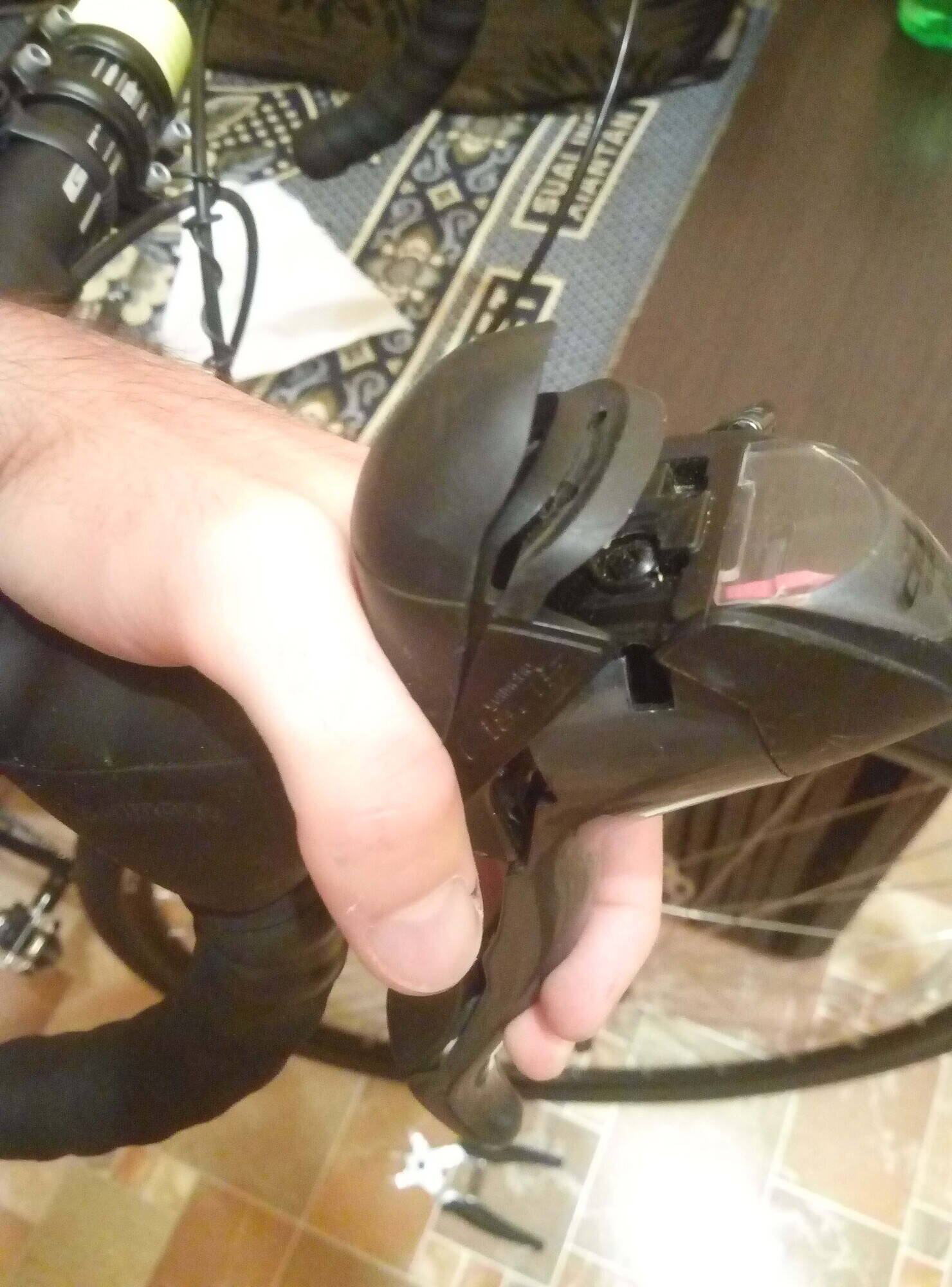У меня Сора 4400(?), так вот индикатор на правом дуале при положении переклюка заднего на малой звезде находится слева. Я вам давал ссылку на пдф- там есть картинки. Получается, что ручка по какой-то причине (загнут или застрял где-то в потрохах трос, или еще что) не сбрасывает на самое крайнее положение, при котором только и видно гнездо в которое входит при установке головка троса. как оно выглядит в этом случае- на моих фото. Я не сильный специалист по дуалам Shimano (вообще и не хочу даже быть, достаточно того что некоторыми пользуюсь), но ИМХО надо смотреть "взрыв-схему" и сопоставлять с тем что у вас, чтоб понять где делать головка троса. По фото не могу понять, куда он там дальше уходит после того как загнут куда-то внутрь (так, по крайней мере, кажется).