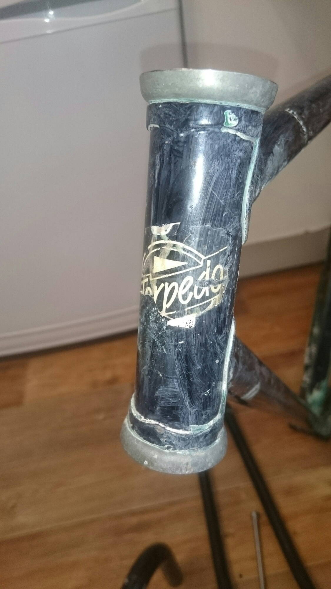 Помогите, пожалуйста, решить загадку. Долго искал похожую раму, остановился на ХВЗ Москва 80 (Олимпиада 80), но все же есть отличия. Покупал б/у, документов не было. Родная краска черная, был перекрашен предыдущим хозяином балончиком в зеленый. Спереди имеется наклейка с надписью Torpedo, под слоем зеленой краски на раме также были обнаружены очертания слова Torpedo. На крокодиле были установлены колеса и переключатель скоростей от ХВЗ.