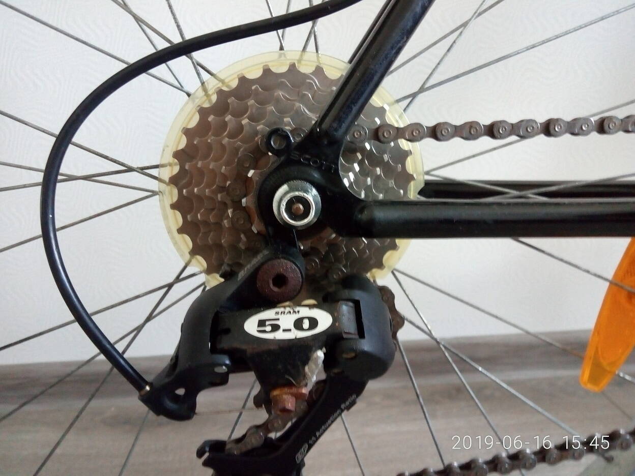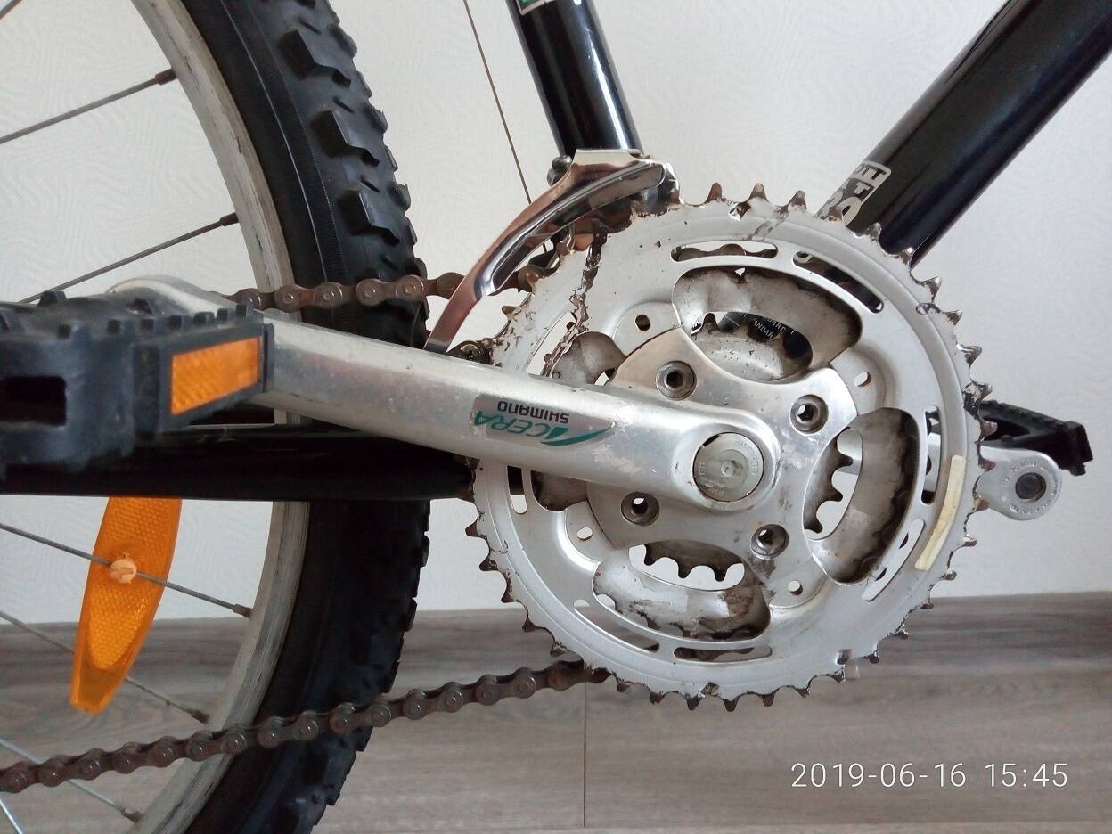 Теперь про вел. В принципе видно все на фото. Костик приехал в разных сандаликах(педали) и на джеки-чановской, мейд ин тайван, резине со злым протектором. Вел немного перебрал и смазал. Каретка шимано, без люфтов, втулки, конуса, шарики в нормальном состоянии. Пока ничего менять не буду. Звезд, походу 8, хотя продавец указал 21 передачу. Костик у нас азиат, как гласит наклеечка на трубе.
