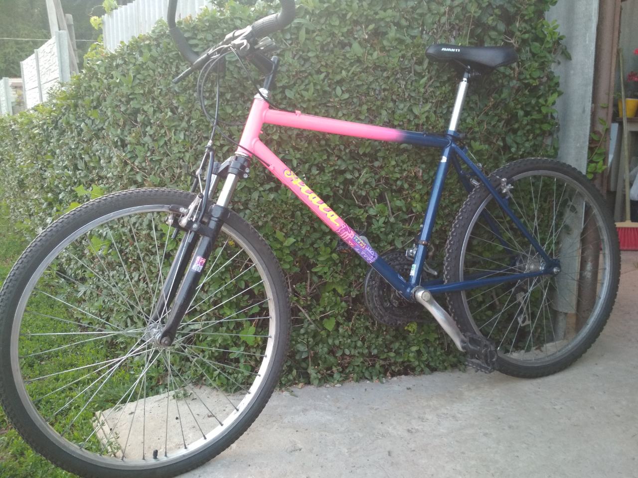 Atala чистая итальянка. Приехала из Франкфурта с покрашеной в черный цвет розовой частью. Чистый оригинал альтуса С 10 1989г. есть наклейка. Рама очень яркая, фото неверно передает. Сталь. Вилка с локаутом, поворотного типа. на штанах стоят две пластиковые гайки при помощи которых можно либо ограничить либо полностью блокировать работу вилки :shock: