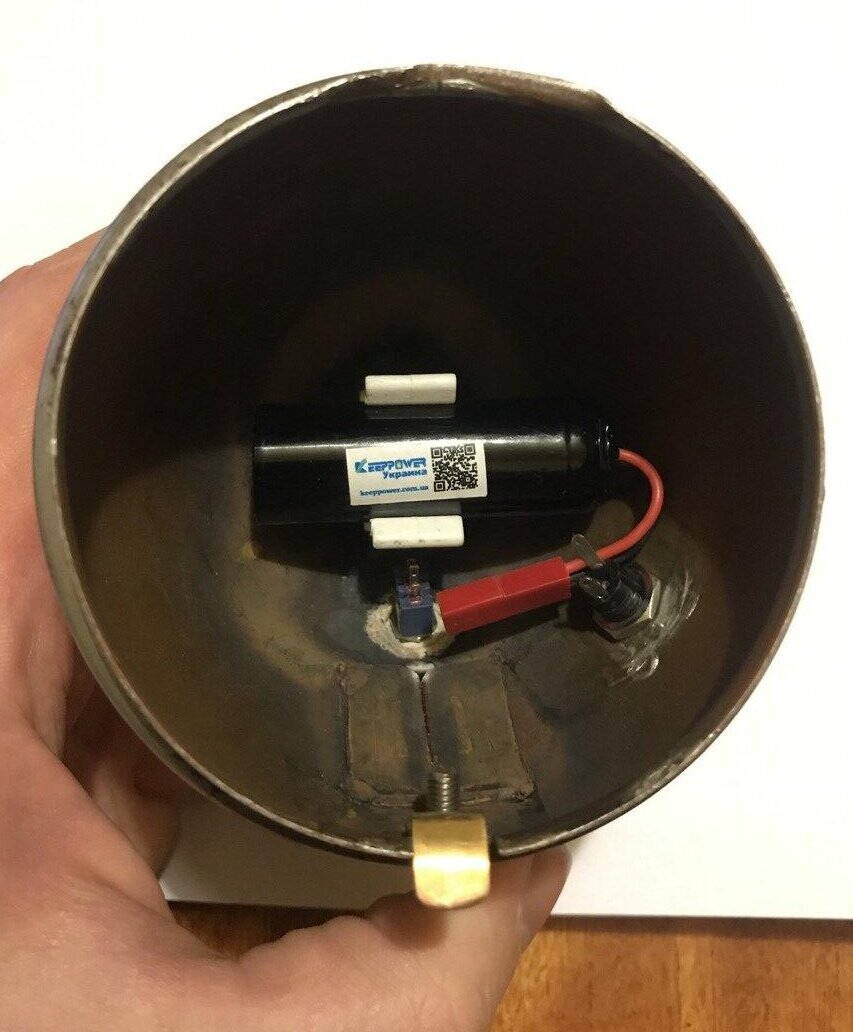 Нашел, что аккумулятор лучше всего утопить в корпусе фары поглубже. Поэтому, предварительно сделав отверстие, паяем металлическую деталь с резьбой (показана выше под №5):