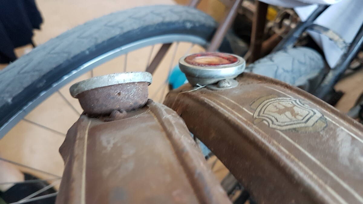 Оба в плохом состоянии, ржавые, местами покоцаные. Если самый ржавый с В-25 у меня открутился легко, то вот второй... который видимо был на велосипеде ГАЗ, судя по эмблеме на остатках крыла, он отказался по-хорошему откручиваться, за что и лишился примерно 3х мм резьбы. Погоняв немного наждачкой ржавчину, решил я разобрать этот с ГАЗа, но... завальцован он хорошо и я пока не стал колупать колечко. А вот катафот от В-25 уже имеет люминевое колечко, которое легко поддалось развальцовке, в следствии чего, один таки я разобрал.