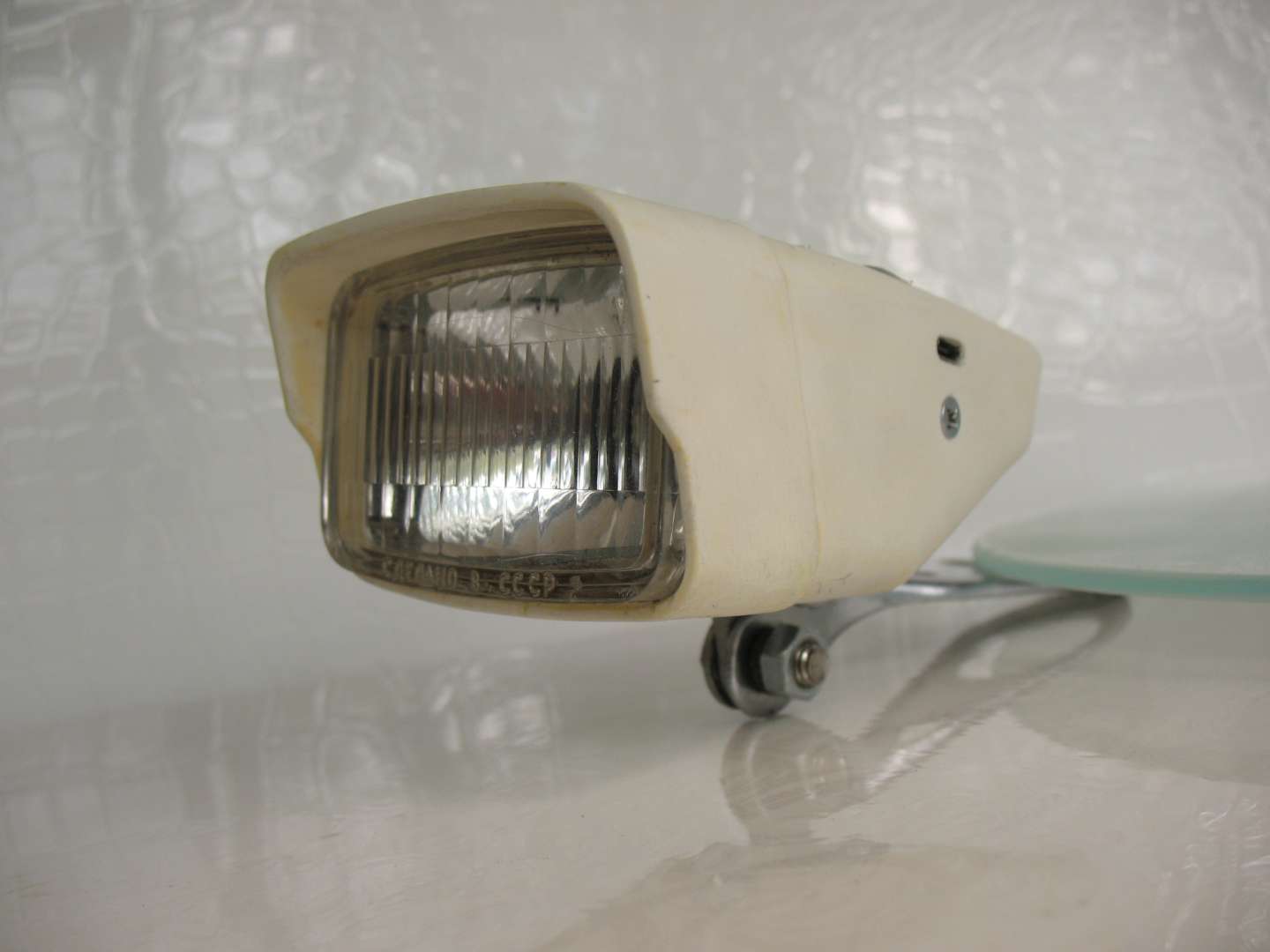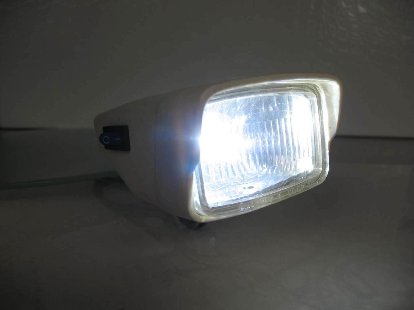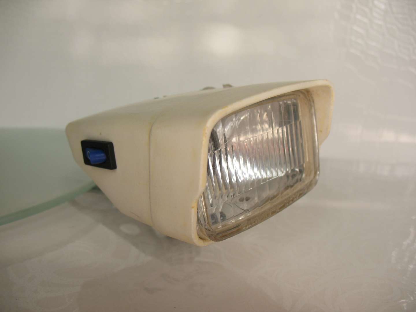 Валялась она у меня давно. В своё время была куплена отцом для "Украины", вроде бы в комплекте с динамкой и задним фонарём. Тамим и стояла большую часть своей жизни. Была оклеена наклейками, Одна вырезка из "Юного Техника" из статьи про законы Мёрфи гласила "Первый закон езды на велосипеде. Независимо от того, куда вы едете, - это в гору и против ветра". Лампочки по 6 вольт постоянно перегорали, и в конце концов была воткнута на 13,5 вольт. Чтоб она нормально светила приходилось ездить довольно бодро :) На солнце она сильно пожелтела, очень сильно, а от наклеек остались светлые пятна. Вид был весьма непрезентабельный. Вон там слегка видно, цвета была такого же как грипсы.