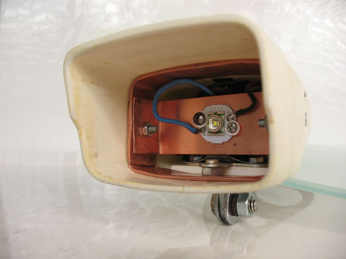 Диод привинчен к медному радиатору из полосы.Драйвера нет, токоограничивающего резистора тоже нет за ненадобностью - аккумуляторы выдают максимум 1,2 ампера, а диод легко переваривает полтора. Собственно простейшая конструкция - батареЙка, лампочка и выключатель. Никаких потерь. Плата зарядки с защитой от переразряда, но поразмыслив я включил диод минуя защиту. Ибо защита должна срабатывать при падении напряжения около 2,5 вольт, но сам-то диод закроется при где-то трёх вольтах. Поэтому и на защиту тоже никаких потерь, а диод светит до последней капли электричества, которую сможет вытянуть.
