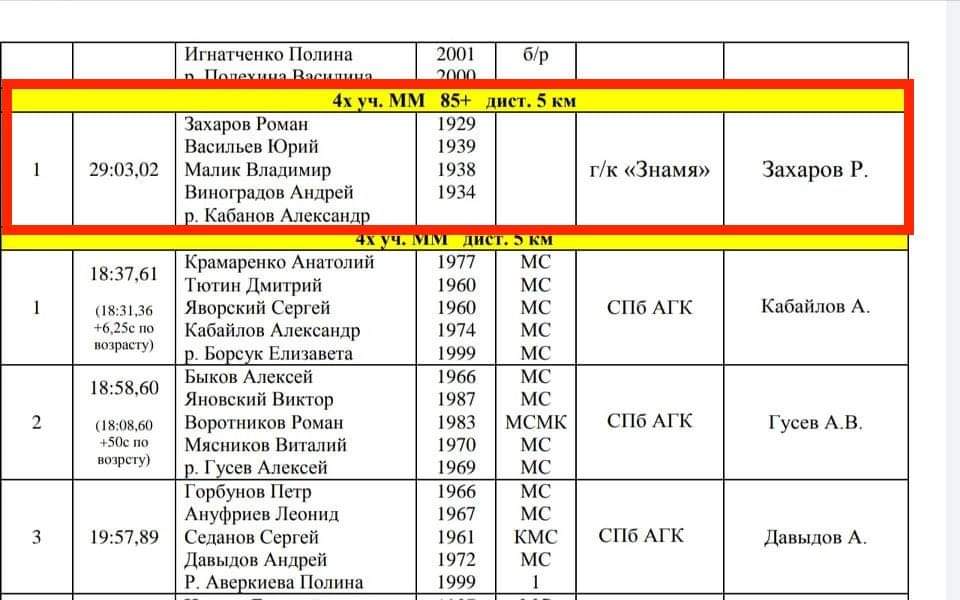 Команда ветеранів в категорії 85+ ( найстаршому-91 рік) на учбовій широкій четвірці парній ( це не гоночний човен) пройшла 5 км за 29 хв.!!!