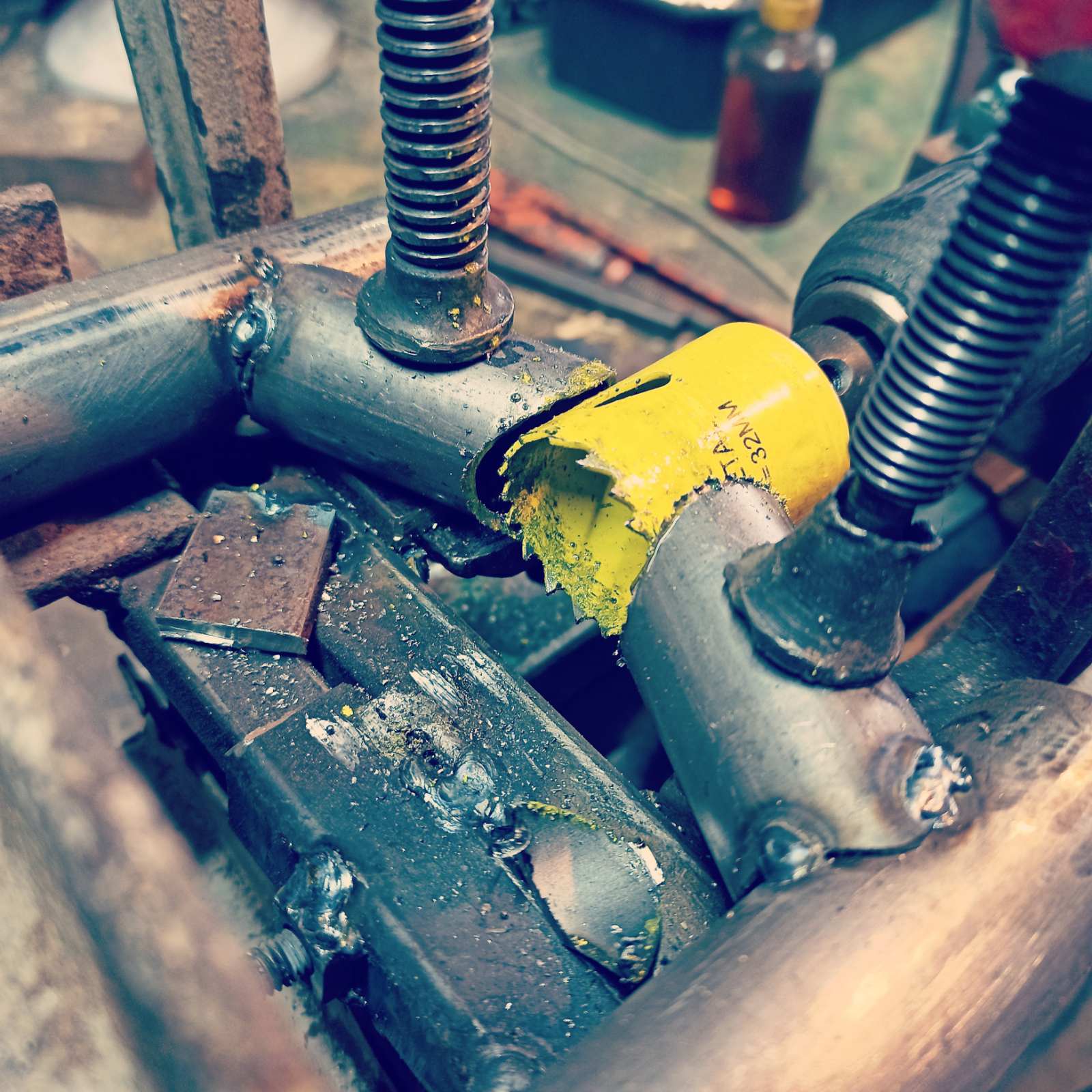 Чтоб сварной шов был красивым, нужно правильно порезать трубу. Проще всего в сверлилку зажать фрезу соответствующего диаметра, и ей подрезать края, для красивого стыка.