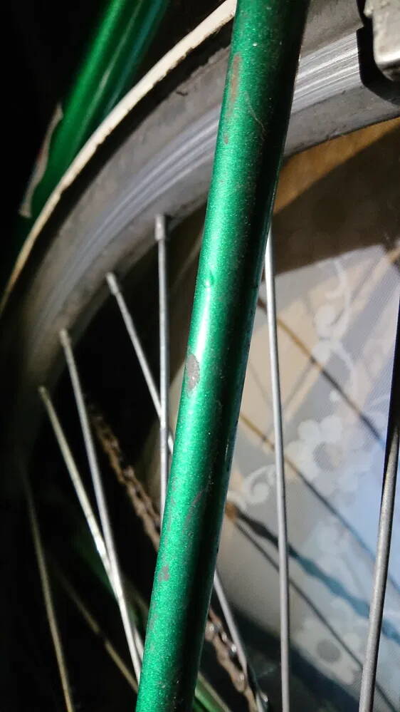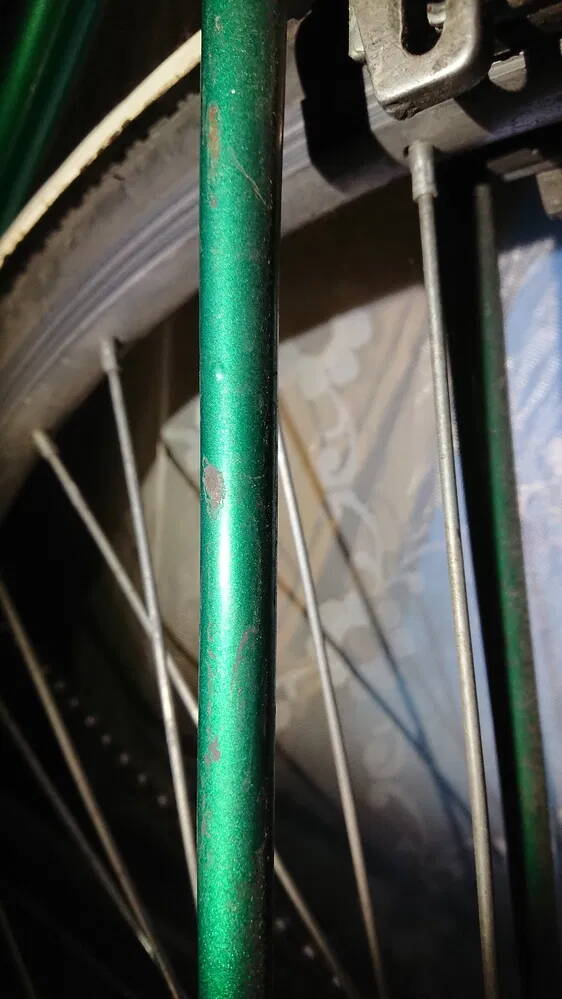 нет уж, на горизонтальной трубе, которую йаицами трут, на подседельной тр, кторой обычно облокачивают безподножечнй вел, на вилке, кторая норовит завалиться и об чонить потереться, - нет повреждений лкп. и только на нижних перьях 1 локальное пятно отсутствующего лкп. а на верхнем - отвалы и трещины поперёк диаметра, явно соответствующие изгибу пера наружу.