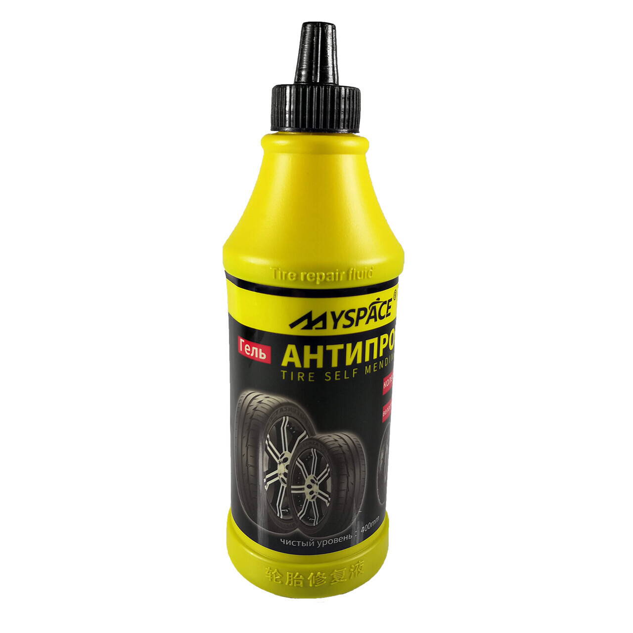 Заклеил 2 дырки в камере, залил тот же Myspace, собрал, накачал, немного спускало, покрутил колесо чтобы антипрокол попал там где заклеено.