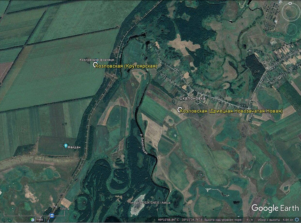 Кстати что касается Козловской крепости. Здесь тоже не всё просто. Дело в том что их было две. Козловская (Крутоярская), как раз эту описал автор, и Козловская (Дриецкая, Новозачатая или Новая). Находилась она на другом берегу речки Берестовая, чуть южнее Скалоновки. Это две разные крепости хоть обе назывались Козловскими.