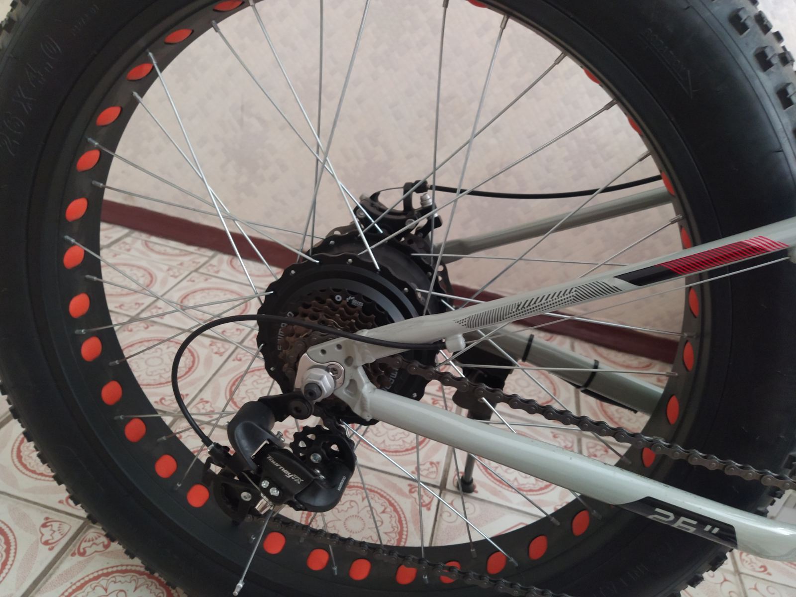 На задній втулці (тобто на моторі) є зірочки, тому втулка (корпус мотора) не симетрична зліва і справа. Щоб компенсувати несиметричність на таких втулках шприхи зліва і справа можуть мати різну довжину. Тобто колесо справа може виглядати більш плоским, ніж зліва.