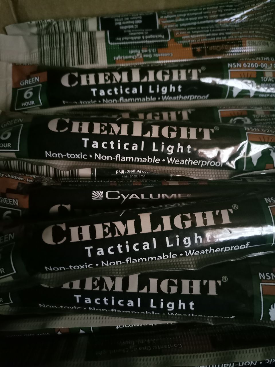Cyalume ChemLight - кращий хімічний світильник, який ви можете купити. Ці військові світлові палички - не дитяча іграшка, яку можна знайти в магазині для вечірок. 4-дюймові лампи ChemLights забезпечують яскраве, надійне освітлення на 360 градусів протягом до 6 годин. Зелений ChemLight настільки яскравий, що його можна побачити на відстані до милі, тому у вас не буде проблем з освітленням невеликих кімнат, проходів, стежок і карт за допомогою всього лише однієї світловий палиці. ChemLight водонепроникний, нетоксичний і негорючий. У світловий палиці є гачок і верхня частина воріт, які забезпечують безпеку джерела світла, незалежно від того, підвішуєте ви, прикріплюєте або нанизуєте їх разом. Щоб активувати ChemLight, просто зігніть, замкніть і струсіть, щоб негайно залити навколишню територію функціональним світлом. Кожен лайтстік індивідуально обгорнутий фольгою для захисту від світла і вологи. ChemLight відповідає специфікаціям Агентства оборонної логістики (DLA) і Агентства НАТО з технічного обслуговування і постачання (NAMSA). Національні / натівські складські номера (NSN) надруковані на кожному продукті для довідки. Виробник ChemLight, компанія Cyalume, є піонером і світовим лідером в області хімічних освітлювальних приладів для тактичного застосування і забезпечення безпеки. Нам довіряють військові і урядові агентства США більше 40 років, тому ви можете бути впевнені, що наші продукти без сумніву будуть працювати тоді, коли вони найбільше потрібні. Вся продукція Cyalume професійно розроблена і здійснена в США в відповідності зі строгими стандартами якості.