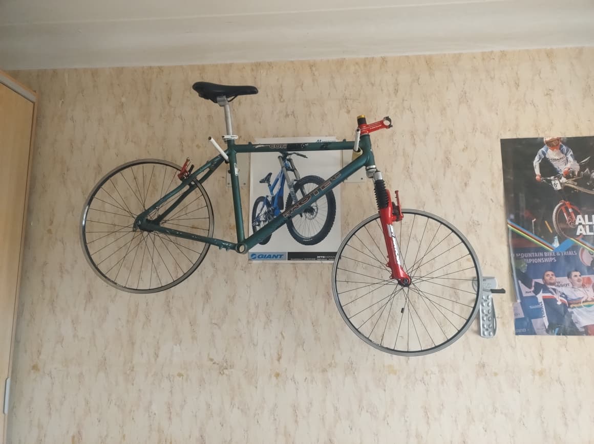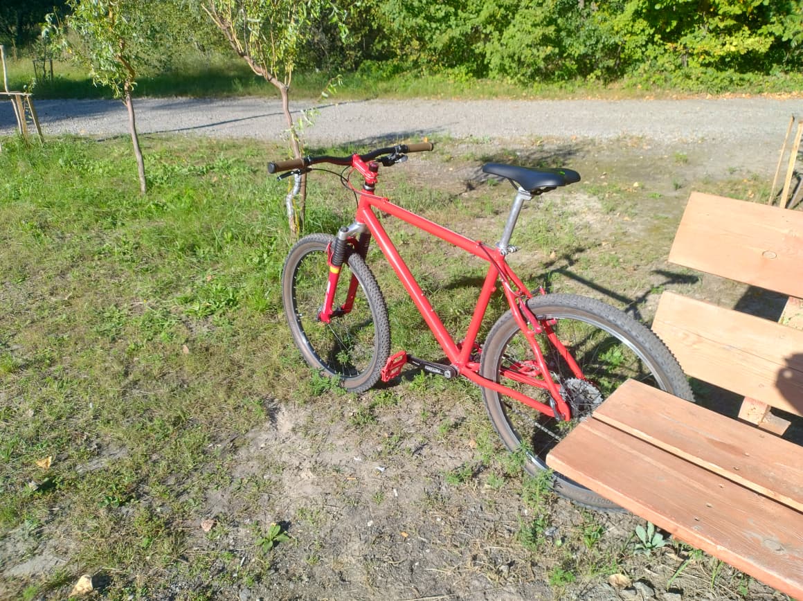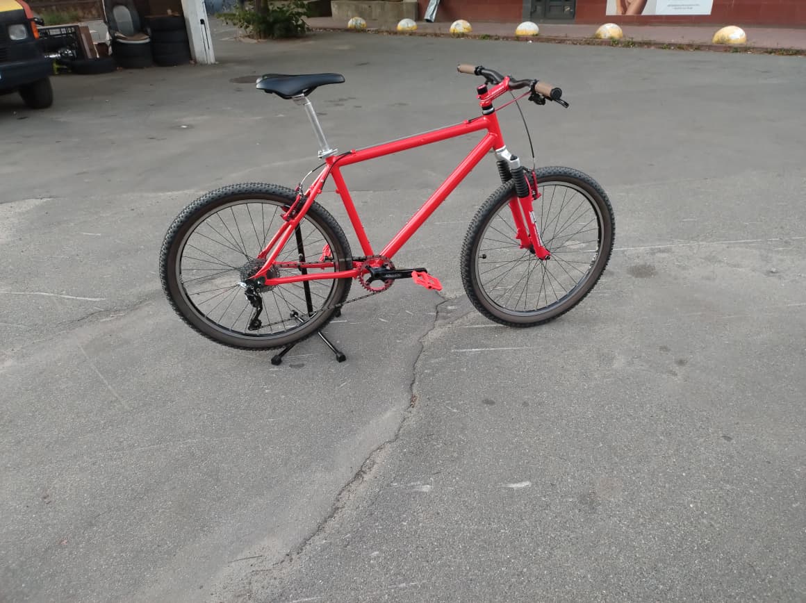 Продам велосипед на базі рами Exotec Comp. Рама 90х років з алюмінію, вагою 1700 грам. Багато кріплень на рамі, для фляготримачів, крил (навіть для переднього), багажника, а також для заспокоювача ланцюга. Рідний колір зелений переливаючий, але зовнішний вигляд був не дуже, тому раму перефарбував у червоний, порошковою фарбою, колір підбирався згідно відтінку вже наявних червоних деталей, тому виглядає як одне ціле. Невеликй нюанс, на вернхній трубі маленька вм'ятина, помітив вже пілся фарбування, на ходові якості не впливає.