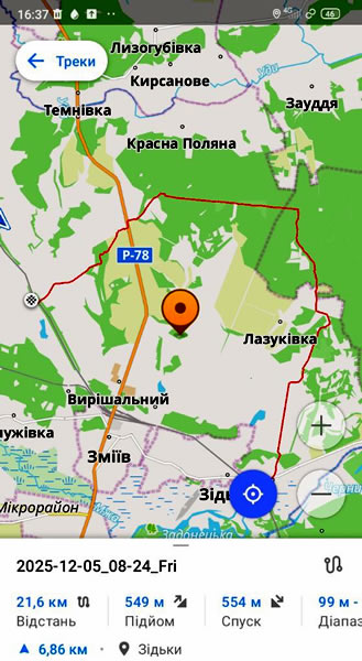 5.12.2025 (пт) Маршрут пройдено. За містом вийшло 22 км по багнюці.