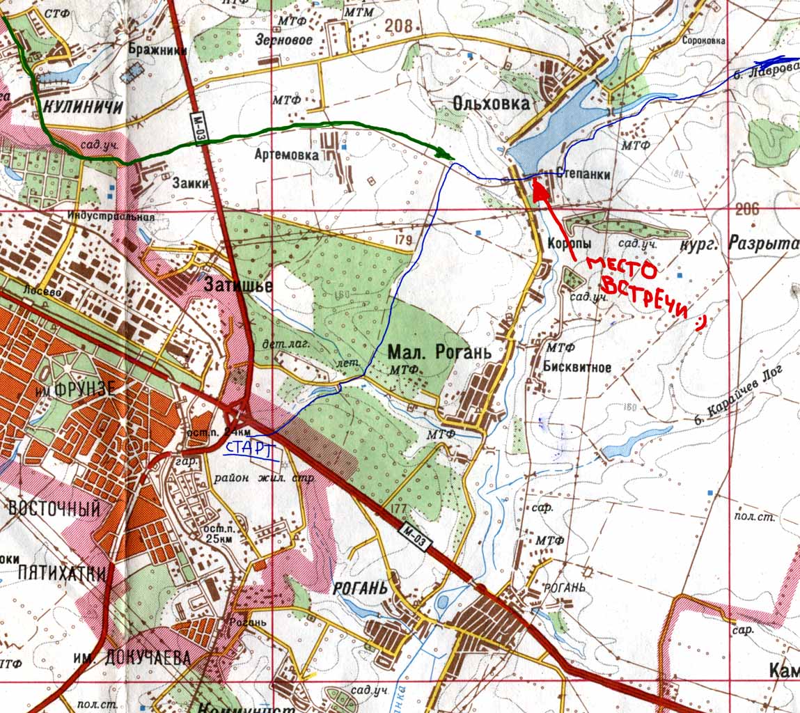 Налало пути до Ольховского пруда (синим цветом)