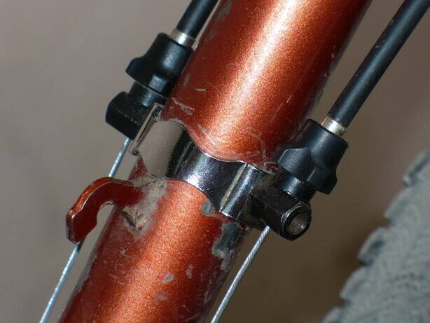 При установке моноблоков тоже столкнулся с проблемой бонок. Времени и желания варить или паять не имел. Имел листовой дюраль толщиной 8 мм. Из него после слесарных работ получились бонки для крепления на раму вместо манеток с помощью стандартного хомута. Диаметр отверстия под рубашки 5,7 мм, под трос - около 3 мм.