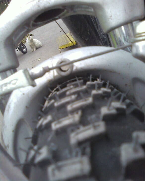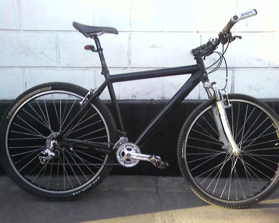 Рама куплена в Харькове, случайно. Начитавшись на форумах о магниевых рамах и их ходовых св-вах, захотелось купить и попробовать на себе. В результате поисков была найдена эта рама. Она была без креплений для тросиков и без краски. Покрасил у нас, в Днепрозержинске, порошковой краской. Крепления для тросиков решил пустить через низ, чтобы освободить верхнюю трубу. Позже выяснилось (когда были куплены покрышки) что при установке покрышки 2,1" она упирается в передний переключатель (слишком широкая рамка). Пришлось сделать "даунгрэйд", передний переклюк Deor LX был заменен на старый полностью железный, но в хорошем состоянии с малым пробегом, Alivio (у него принцип работы как у шоссейных переклюков и он под нижнюю тягу). Пришлось над ним немного поиздеваться. В результате чего он стал весить 135 грамм (меньше чем LX) и налазить на эту трубу 32мм. Изначально был под трубу 28мм или что-то около того. При верхнем расположении тросиков даже не знаю что бы я делал. Крепления для скоростных тросиков приклеил эпоксидной смолой. Тот, который на пере держится, те что на рулевой колонке отпали, нужно что-то придумать. Крепления для заднего тормоза на заклепках.