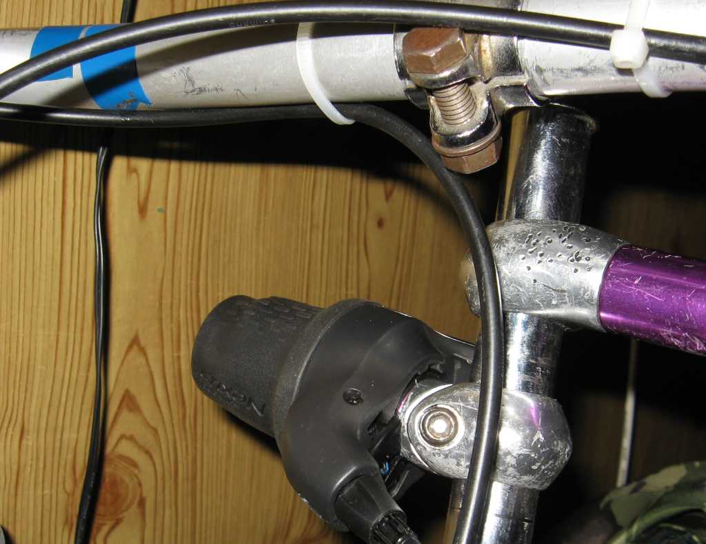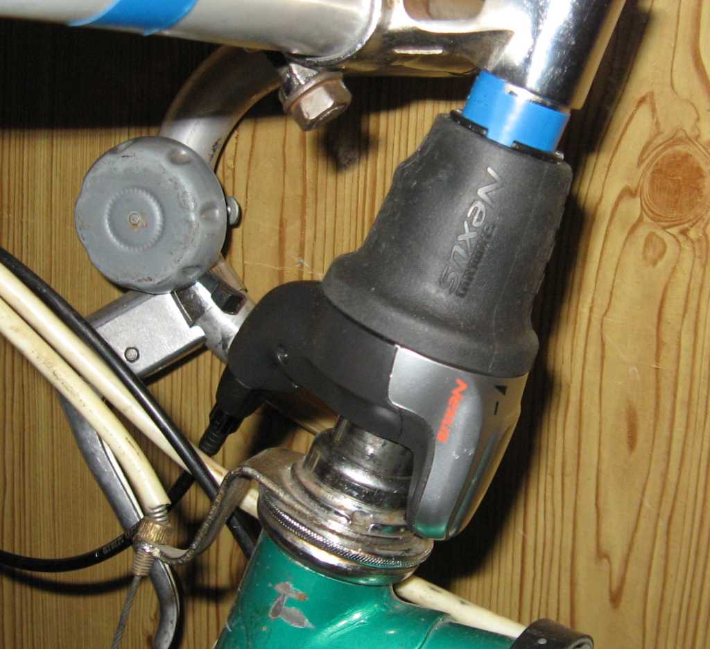 Как и предполагалось колесо имело больший OLD чем положено, поэтому к раме был применён приём "Геракл раздирающий пасть", с N-ной попытки колесо было впердолено, при этом как ни странно я умудрился ничего не сломать (а [strike]пластиковый переклюк[/strike] драйвер на втулке очень просился) и не сильно нарушить геометрию перьев (во всяком случае на глаз ниткой через руль не выявил). Из за несовпадения размеров ревошифтер, по подсмотренному тут же решению, временно был установлен на рулевой штырь на изоленту (колхоз № раз) (Позже тест драйв показал, что решение не совсем удобное). Тросик был проложен мимо бонок и пристёгнут к раме пластиковыми хомутиками. И в момент подключения тросика к втулке вылезла первая засада: в комплекте не оказалось защитного кожуха на тросик (выяснилось, что оно идёт не ко всем втулкам), который одновременно служит упором рубашки. Попытка установить шайбу приводила к сильному вытягиванию тросика (и потере трёх скоростей), резать рубашку не хотелось. И тут, совершенно случайно, под руку попалась половинка железячки от пятыштырькового магнитофонного разъёма :-) Которая при помощи пассатижей и такой то матери превратилась в упор-переходник, который почти идеально подходил по размерам. колхоз № два Осталось только настройкой ревошифтера совместить риски на переклюке и вуаля.