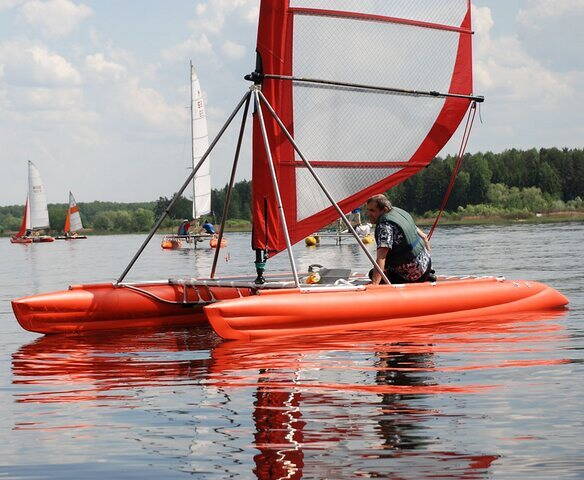 2. Без всячески сюрпризов с мелким деталями и последовательностью сборки, за десять минут надуть катамаран (електрической помпой), ещё десять минут поставить мачту с парусом. Покататься 5.5 часов на заведомо компромиссной лодке. За десять минут сдуть лодку.