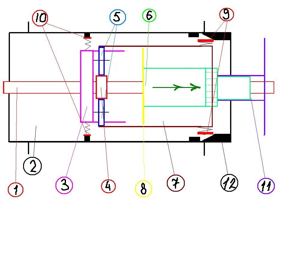 Теперь тросик передвинул кроме втулки-ползуна 6 ещё и внешнюю звезду 7 наружу.При этом собачки 9 упёрлись в пологий буртик 12(я обозвал это место "парковочной зоной) на корпусе втулки и приподнялись,выйдя из зацепления с корпусом(скользят по парковочной зоне).Сейчас вращение от задней звездочки,закреплённой на промежуточном конусе 11 передаётся через шлицевое соединение втулке-ползуну 6.От него,через,опять же шлицевое соединение-внешней звезде 7,и далее на внешние стороны планетарных шестерён 5.Шестерни,своей внутренней стороной прокатываясь по зубьям 4 вращают водило 3,приводя его в движение через свои оси с указанным выше понижающим коэффициентом скорости.Водило передаёт своё вращение корпусу втулки через собачки 10.