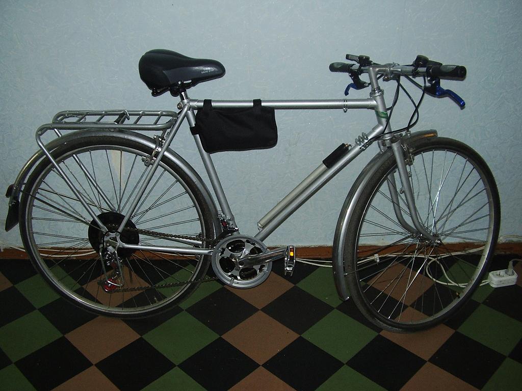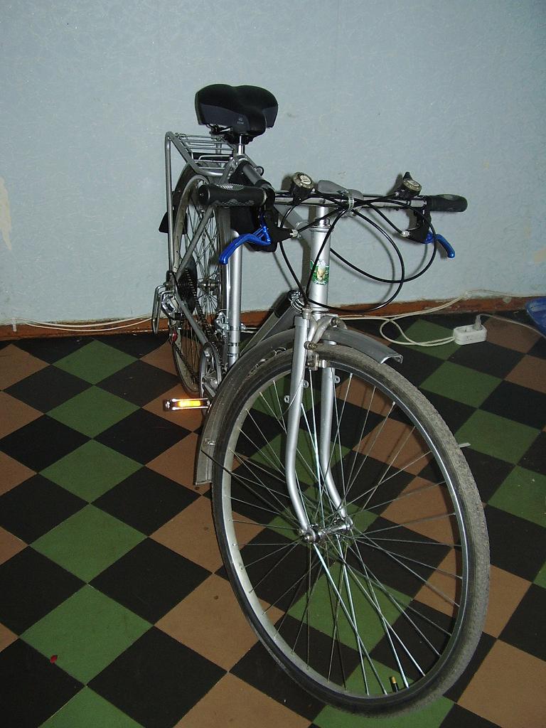Вытянул из гаража убитый "турист" и решил довести его до ума. (Фотка в разобраном виде 1). Перекрасил, задул из балонов (Bonsy) предварительно прогрунтовав (Сhampion color) из старого осталось только рама, вилка, переднее колесо и тормоза. Заднее колесо со втулкой у кассетой "условно" новое - десять лет как запаска валялось в гараже, в работе небыло, собрал его тогда от нечего делать, обод аллюминиевый. Старую каретку выкинул, поставил "под квадрат", шатуны поставил Lasco, педали FPO, передний и задний переключатели и шифтеры, "бюджетный вариант" - Yuanda, Xundan, Yuanda. Бонки на раму не напаивал, обошелся хомутами. Седлушка "Grandstar". Багажник и крылья под Украину, родным - хана. Вкинул ножку, задний щиток ну и так, по мелочам. Впринципе результатом работы доволен, велик бегает хорошо. Бабки появятся заменю колеса, поставлю с путевыми ободами, вкину вилку с амортизатором, покрышки сменю, буду дальше "накручивать" по мере возможности. Интересно мнение посетителей форума касательно результата работы