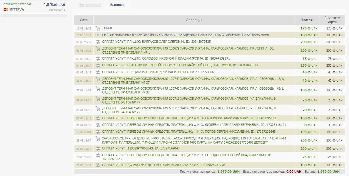 Интересно, я 21.04 перевел сотку, 22 списали. В отчете не вижу эту операцию. My fault. Не досмотрел, почему-то назад денежка вернулась, хотя все реквизиты указал.:shock:. Приват в своем репертуаре? Мне на карту 5 дней назад перевели деньги с Привата, у человека списали, а ко мне они не пришли. :evil: